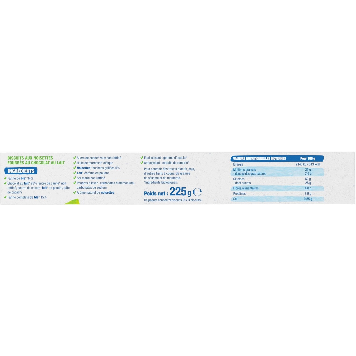 Farine de BLÉ* 34%, chocolat au LAIT* 25% (sucre de canne* non raffiné, beurre de cacao*, LAIT* en poudre, pâte de cacao*), farine complète de BLÉ* 15%, sucre de canne* roux non raffiné, huile de tournesol* oléique, NOISETTES* hachées grillées 5%, LAIT* écrémé en poudre, sel marin non raffiné, poudres à lever : carbonates d'ammonium, carbonates de sodium ; arôme naturel de NOISETTES, épaississant : gomme d'acacia* ; antioxydant: extraits de romarin*. *Ingrédients biologiques.