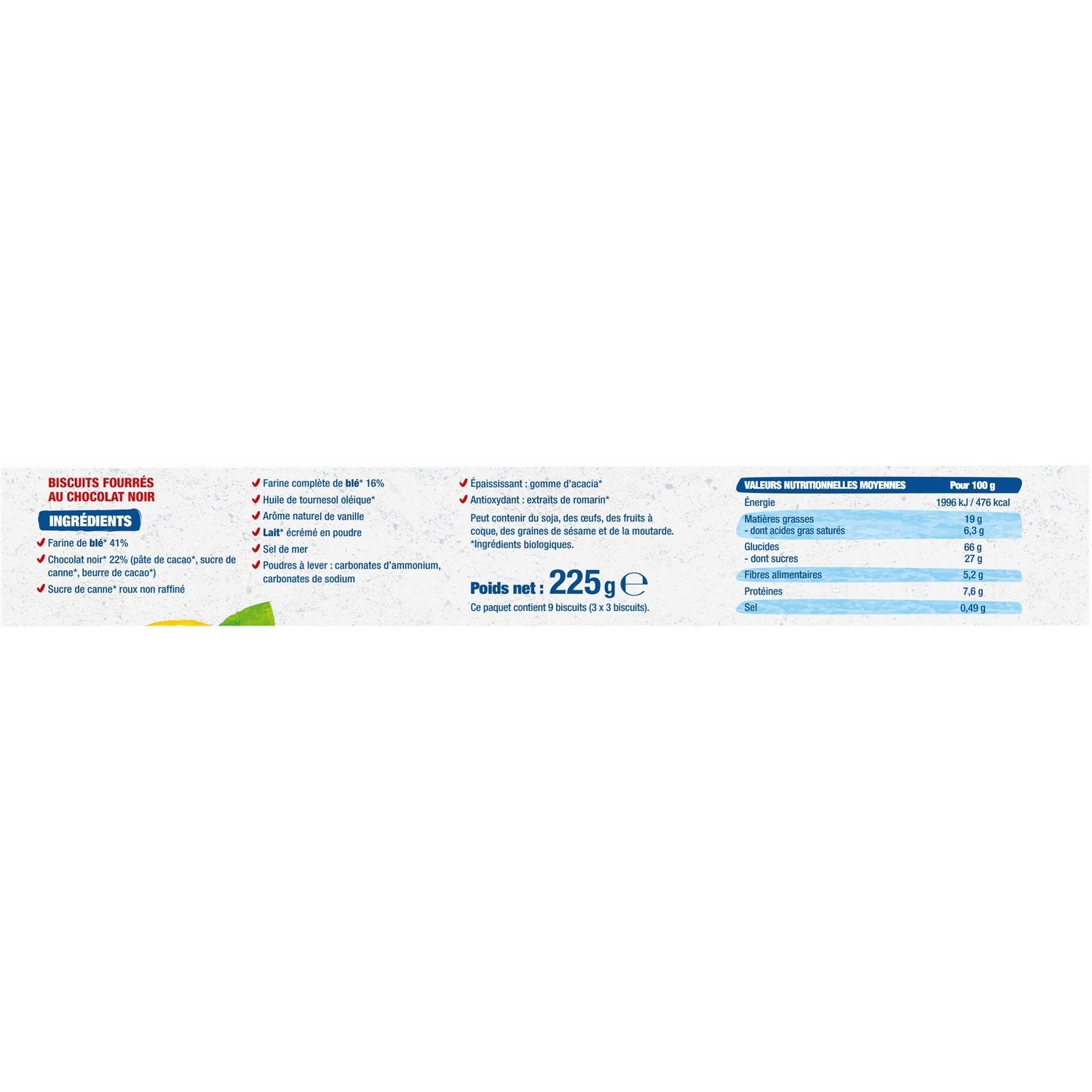 Farine de blé* 41%, chocolat noir* 22% (pâte de cacao*, sucre de canne*, beurre de cacao*), sucre de canne* roux non raffiné, farine complète de blé* 16%, huile de tournesol oléique*, arôme naturel de vanille, LAIT* écrémé en poudre, sel de mer, poudres à lever : carbonates d'ammonium, carbonates de sodium ; épaississant : gomme d'acacia* ; antioxydant: extraits de romarin*.