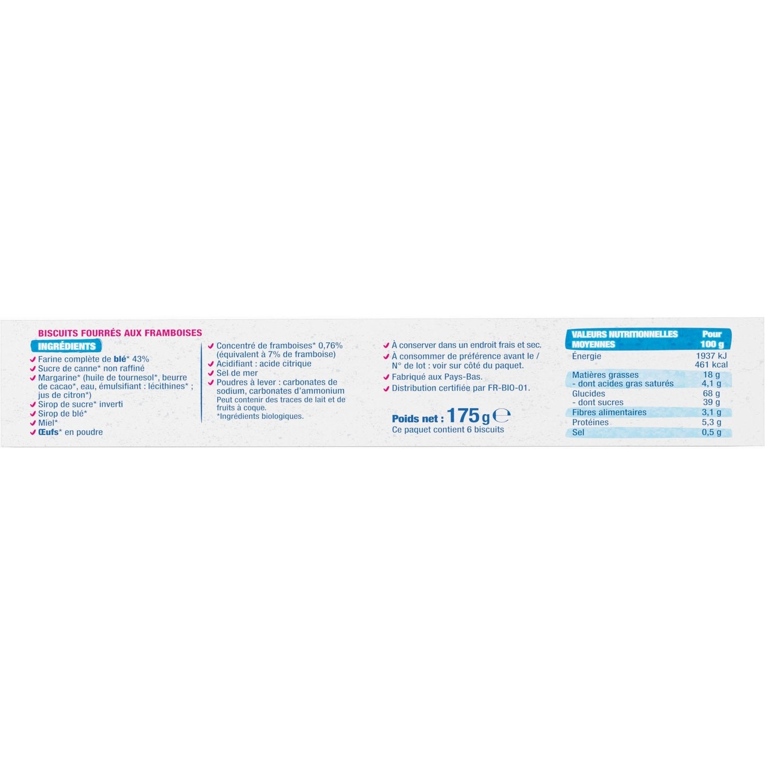 Farine semi-complète de blé* 42%, sucre de canne* non raffiné, graisses végétales* (huile de tournesol*, beurre de cacao*), sirop de sucre* inverti, sirop de blé*, miel*, OEUFS* entiers en poudre, concentré de framboises* 0,8% (équivalent à 7% de framboise), acidifiant : acide citrique ; sel de mer, poudres à lever : carbonates de sodium, carbonates d'ammonium; jus de citron*, émulsifiant : lécithines*.