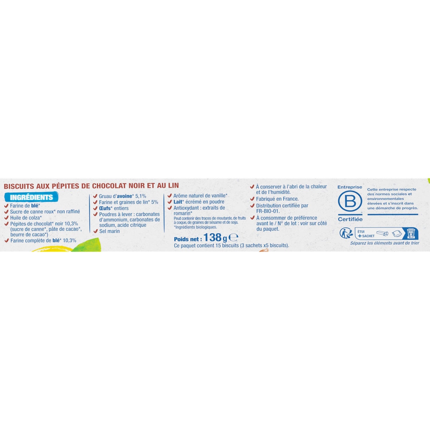 Farine de BLÉ*, sucre de canne roux* non raffiné, huile de colza*, pépites de chocolat* noir 10,3% (sucre de canne*, pâte de cacao*, beurre de cacao*), farine complète de BLÉ* 10,3%, gruau d'AVOINE* 5,1%, farine et graines de lin* 5%, ŒUFS* entiers, poudres à lever : carbonates d'ammonium, carbonates de sodium, acide citrique; sel marin, arôme naturel de vanille*, LAIT* écrémé en poudre, antioxydant : extraits de romarin*. *Ingrédients biologiques.