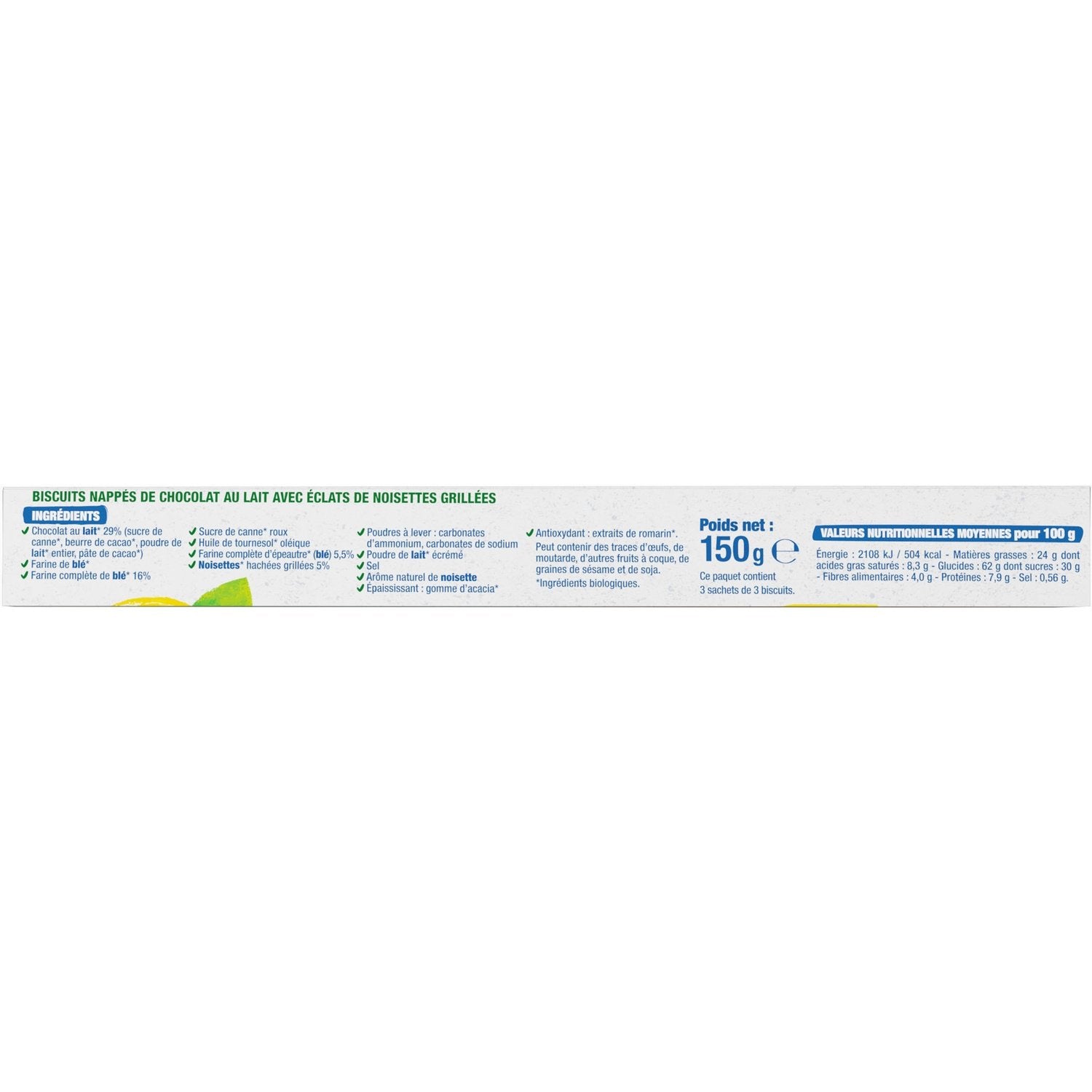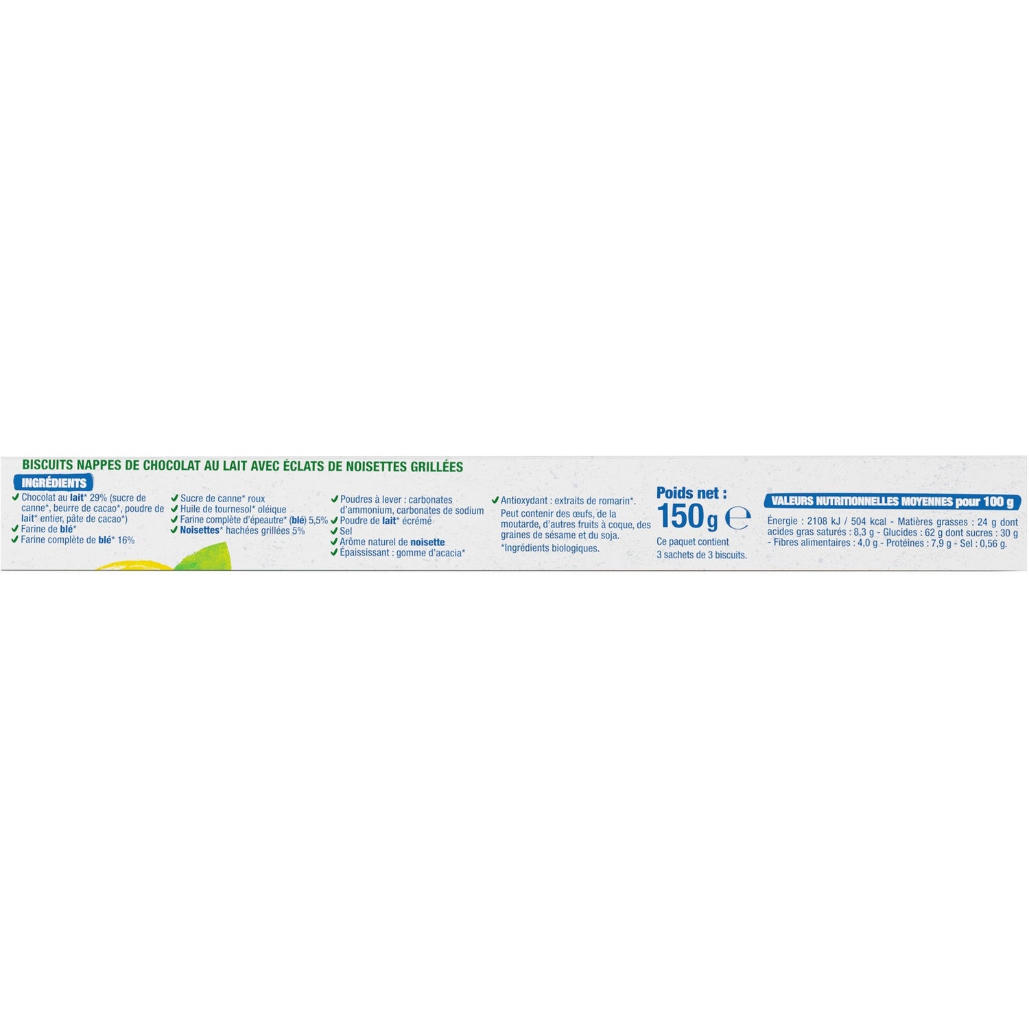 Chocolat au LAIT* 29% (sucre de canne*, beurre de cacao*, poudre de LAIT* entier, pâte de cacao*), farine de blé*, farine complète de blé* 16%, sucre de canne* roux, huile de tournesol* oléique, farine complète d'épeautre* (blé) 5,5%, noisettes* hachées grillées 5%, poudres à lever : carbonates d'ammomiun, carbonates de sodium; poudre de LAIT* écrémé, sel, arôme naturel de noisette, épaississant : gomme d'acacia*, antioxydant : extraits de romarin*.
