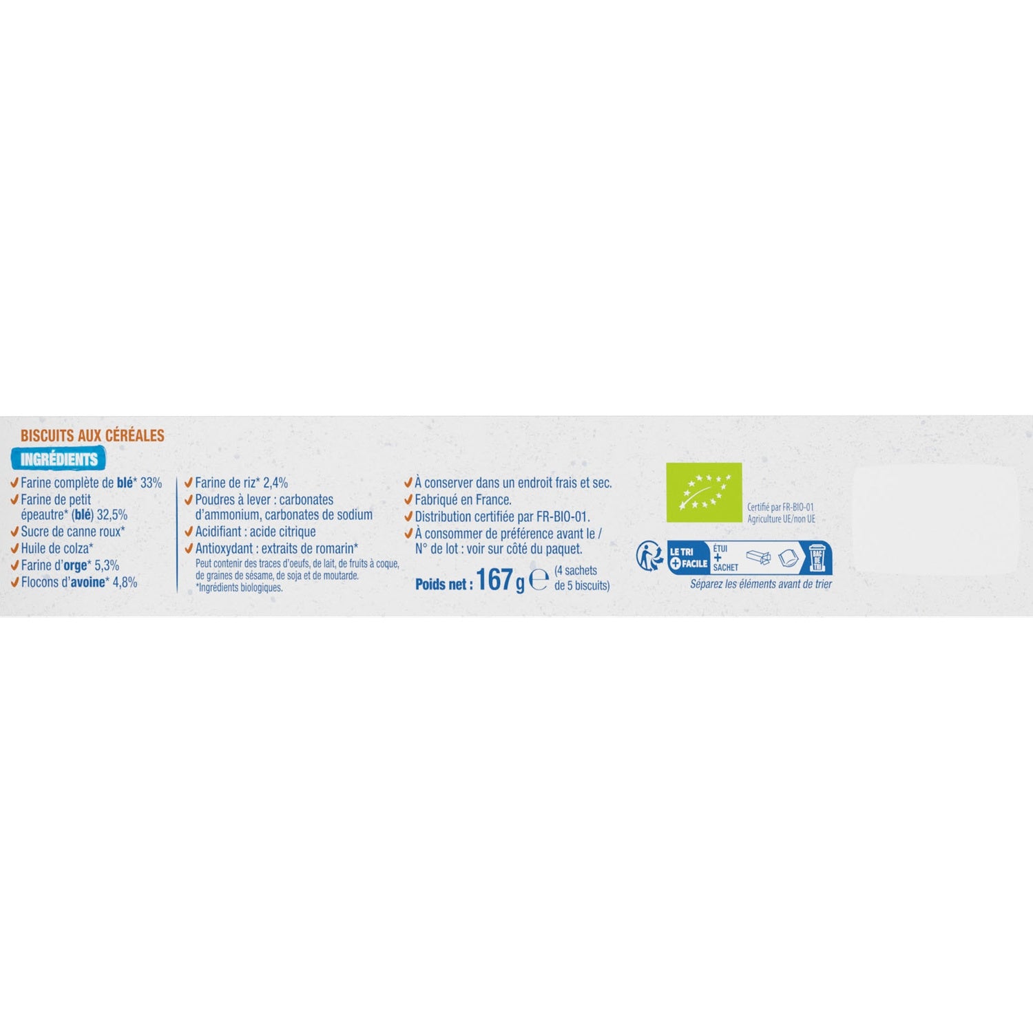 FARINE COMPLÈTE DE BLÉ* 33%, farine de petit épeautre* (BLÉ) 32,5%, sucre de canne roux*, huile de colza*, farine d'ORGE* 5,3%, flocons d'AVOINE* 4,8%, farine de riz* 2,4%, poudres à lever : carbonates d'ammonium, carbonates de sodium; acidifiant : acide citrique; antioxydant : extrait de romarin*. *Ingrédients biologiques