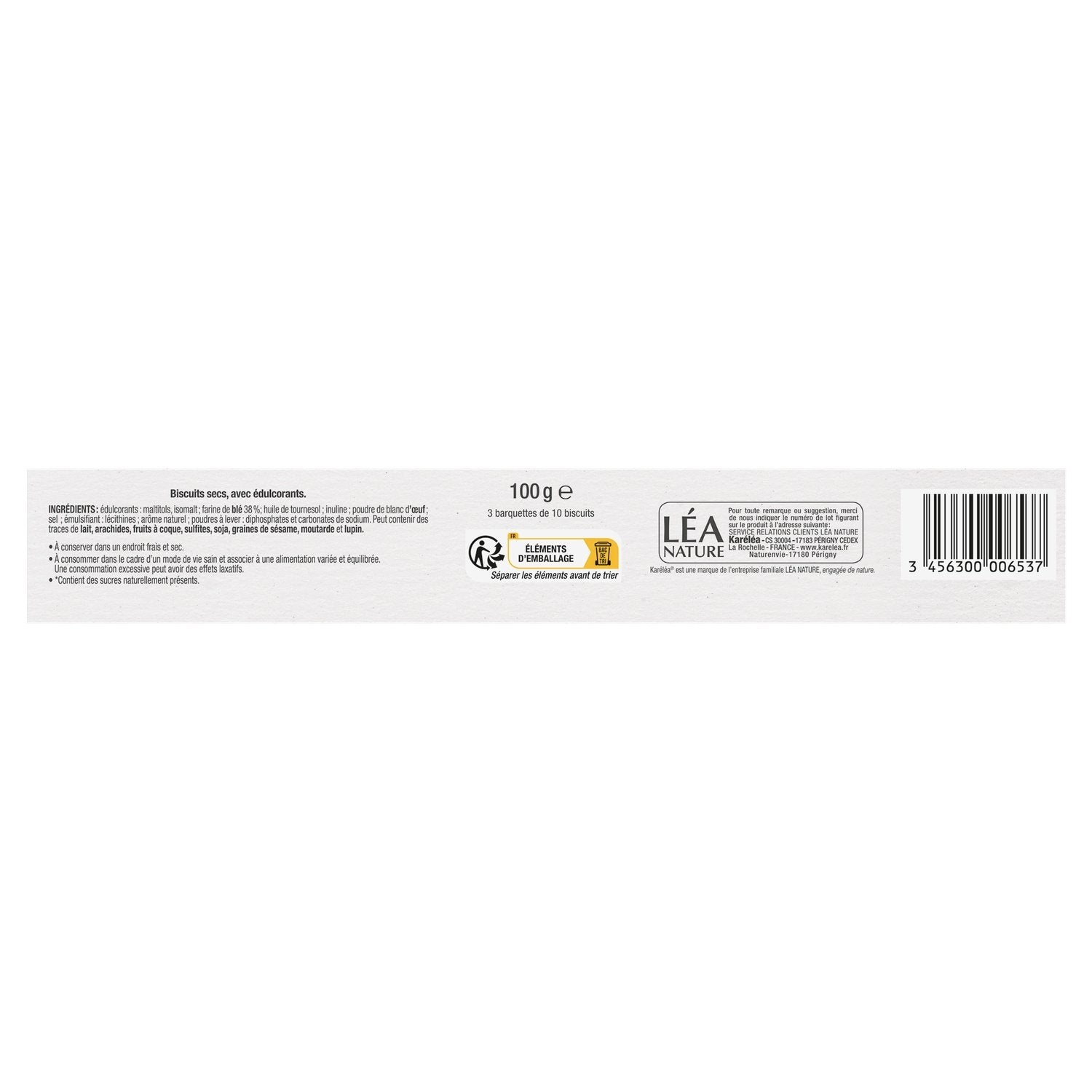 Ingrédients : édulcorants : maltitols, isomalt ; farine de BLE 38% ; huile de tournesol ; inuline ; poudre de blanc d'OEUFS ; sel ; émulsifiant : lécithines ; arôme naturel ; poudres à lever : diphosphates, carbonates de sodium. Peut contenir des traces de LAIT, ARACHIDES, FRUITS A COQUE, SULFITES, SOJA, graines de SESAME, MOUTARDE et LUPIN.