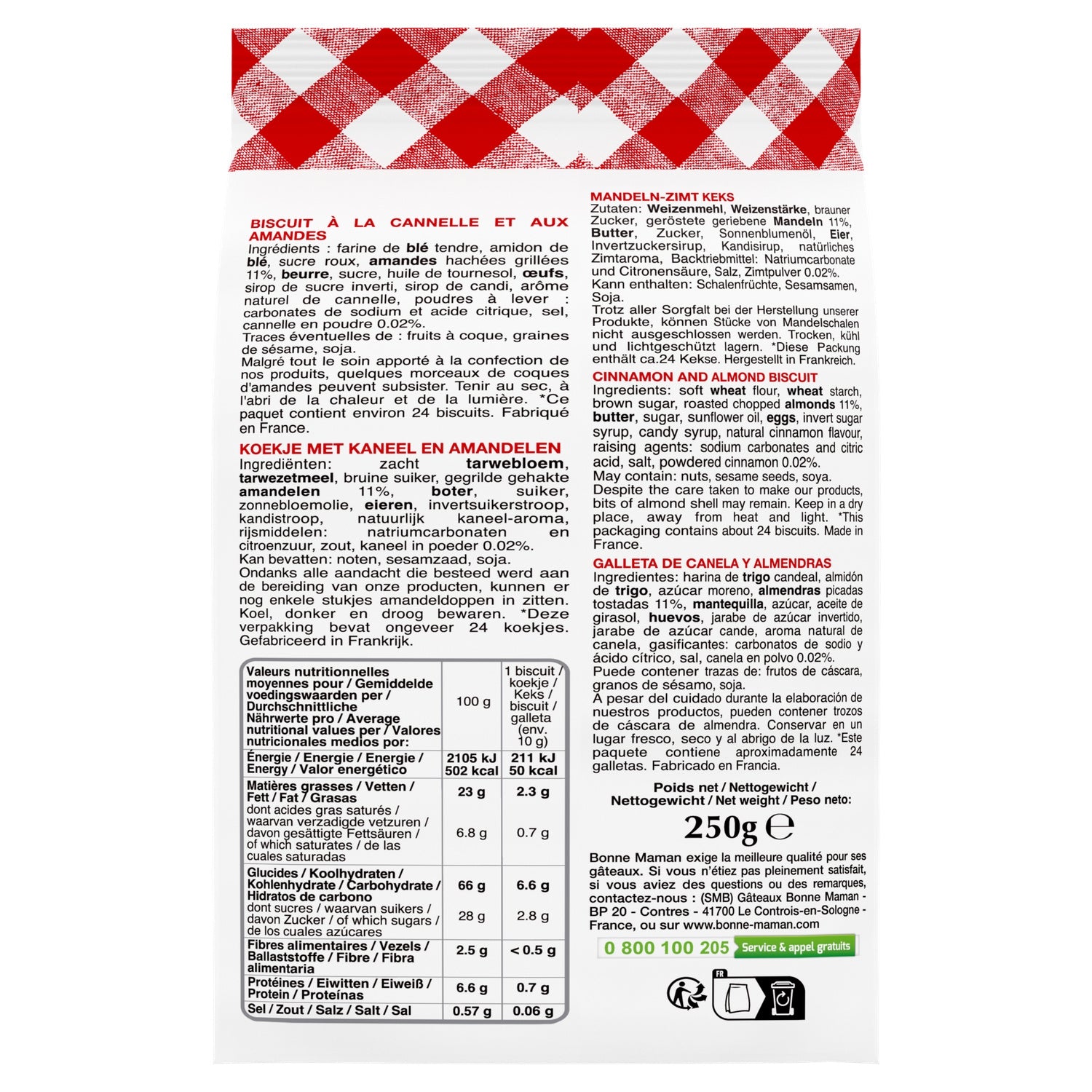 farine de BLÉ tendre, amidon de BLÉ, sucre de canne roux, AMANDES hachées grillées 11%, BEURRE, sucre, huile de tournesol, ŒUFS, sirop de sucre inverti, sirop de candi, arôme naturel de cannelle, poudres à lever : carbonates de sodium et acide citrique, sel, cannelle en poudre 0,02%