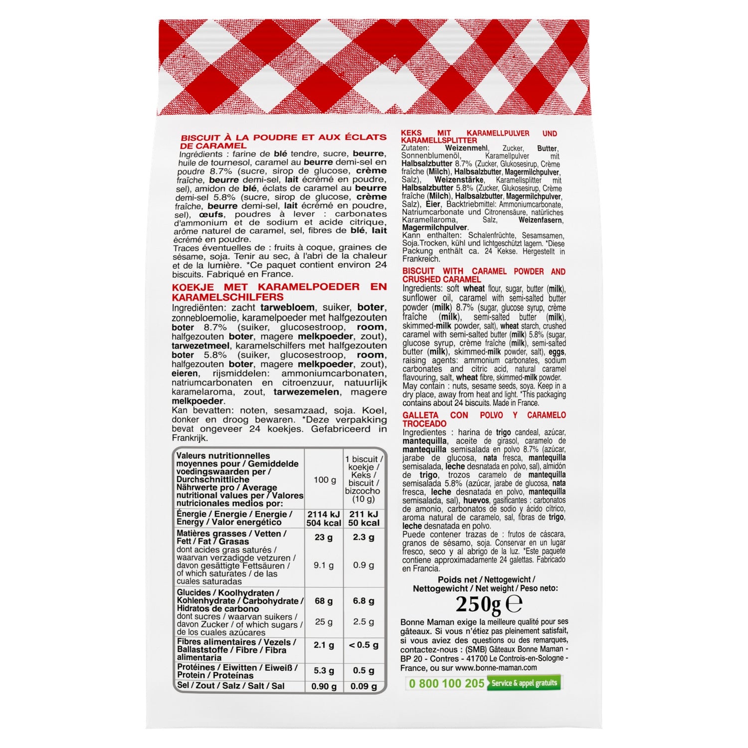 farine de BLÉ tendre, sucre, éclats de caramel au BEURRE demi-sel AOP d'Isigny et à la fleur de sel de Guérande 14% (sucre, sirop de glucose, CRÈME fraîche, BEURRE d'Isigny AOP, LAIT écrémé en poudre, fleur de sel de Guérande), BEURRE, huile de tournesol, amidon de BLÉ, ŒUFS, poudres à lever : carbonates d'ammonium et de sodium et acide citrique, arôme naturel de caramel, sel, fibres de BLÉ, LAIT écrémé en poudre