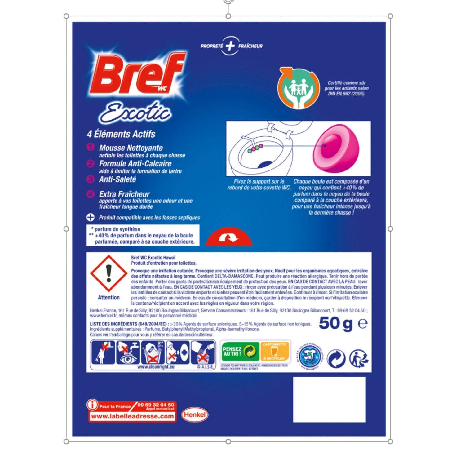 Bref WC est l'expert du nettoyage de toilettes en toute simplicité. Avec sa formule unique aux 4 éléments actifs, Bref WC Power Activ' empêche le dépôt de calcaire, apporte une mousse nettoyante, une protection anti-saleté ainsi qu'une fraîcheur renforcée pour les toilettes. Chaque boule est composée d'un noyau qui contient +40% de parfum* comparé à la couche extérieure. Bref Power Activ' dure jusqu'à 250 chasses. Bref Power Activ' Exotic Hawaï* est un bloc wc qui maintient les toilettes propres et fraîches avec un parfum exotique de Fleur d'Hibiscus* à chaque chasse. *Parfum de synthèse