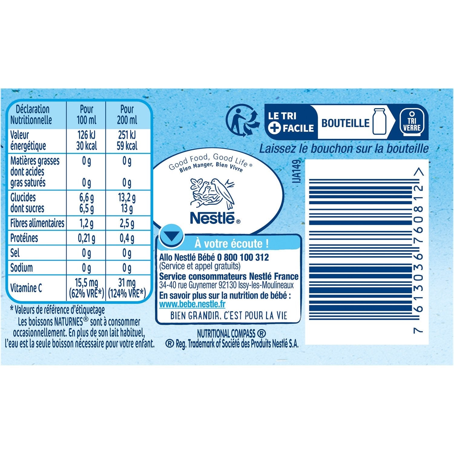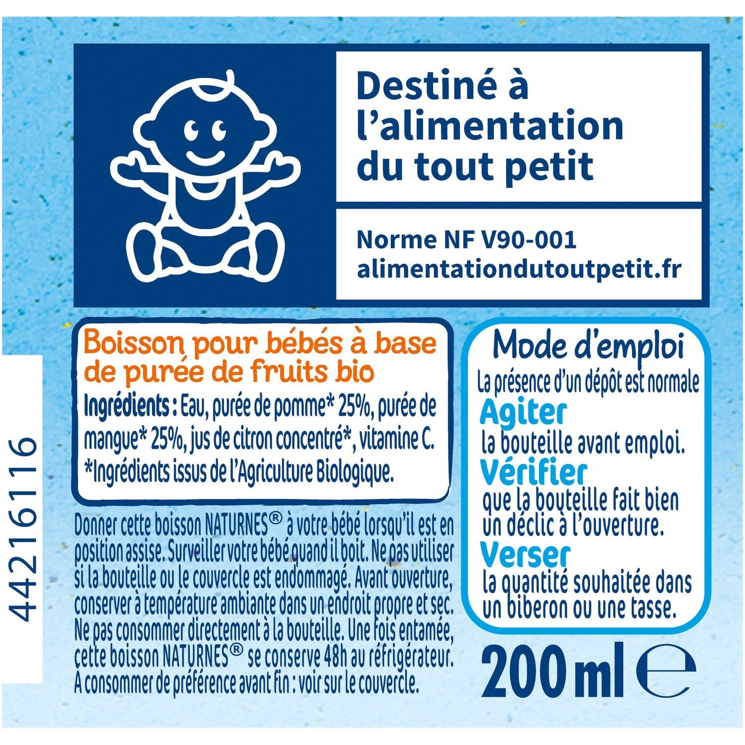 NATURNES Bio, c'est toute l'expertise de NATURNES avec des ingrédients agricoles issus de l'Agriculture Biologique participant au respect de l'environnement et de la biodiversité, conformément aux règles de production biologique. Découvrez NATURNES BIO Boisson : Des boissons pour bébé à base de purée de fruits bio. Mode d'emploi : Agiter la bouteille avant emploi, vérifier que la bouteille fait bien un déclic à l'ouverture, verser la quantité souhaitée dans un biberon ou une tasse. La présence d'un dépot est normale. En plus de son lait habituel, l'eau est la seule boisson nécessaire pour votre enfant.