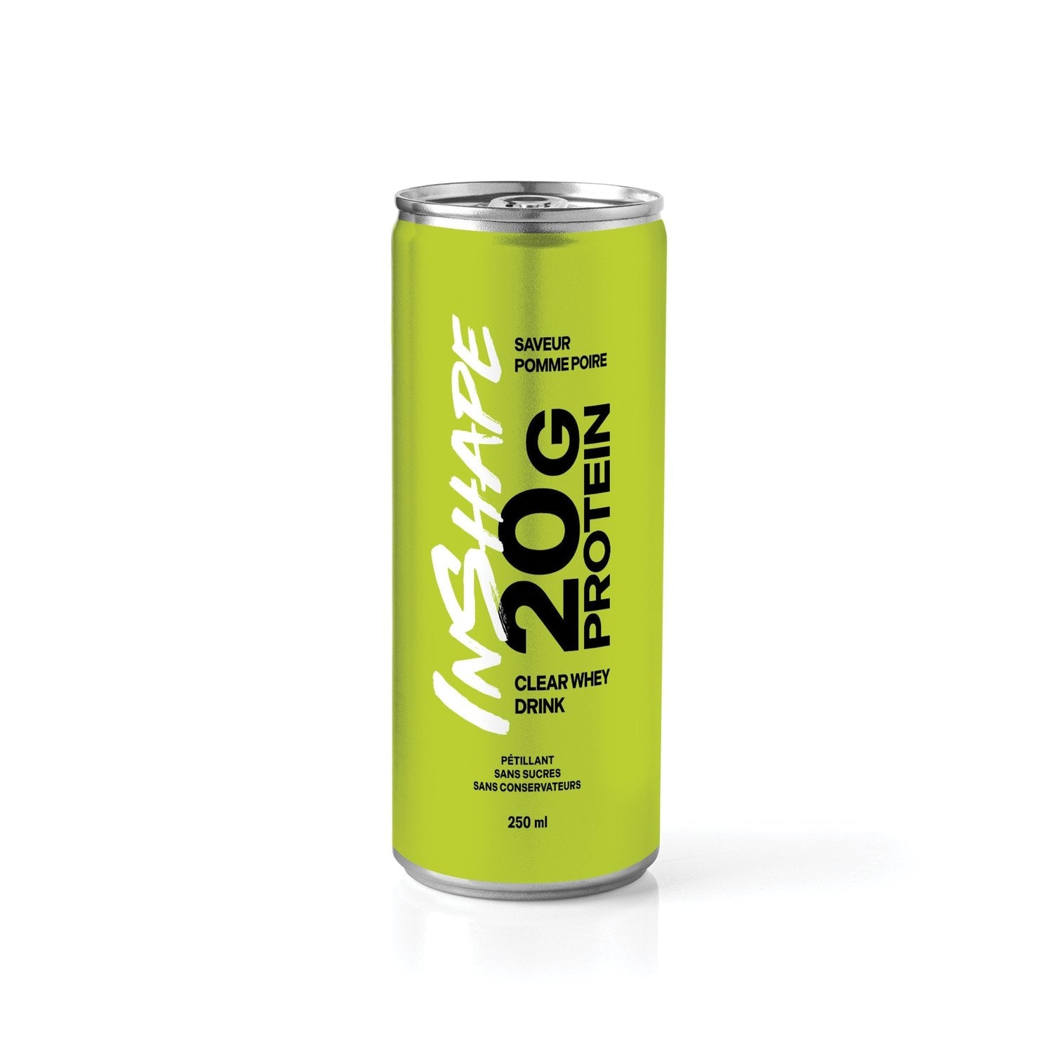La clear whey prête à boire, fraicheur et hydratation garantie ! La boisson protéinée fraiche et légère ! La boisson protéinée rafraîchissante sans sucres ni matières grasses ! Saveur Pomme poire Thé pêche. - Boisson Pétillante, légère et fruitée - 20 g de protéines par canette - Sans sucres - Sans matières grasses - Seulement 83 kcal par canette À boire bien frais pour un maximum de plaisir et de fraîcheur !