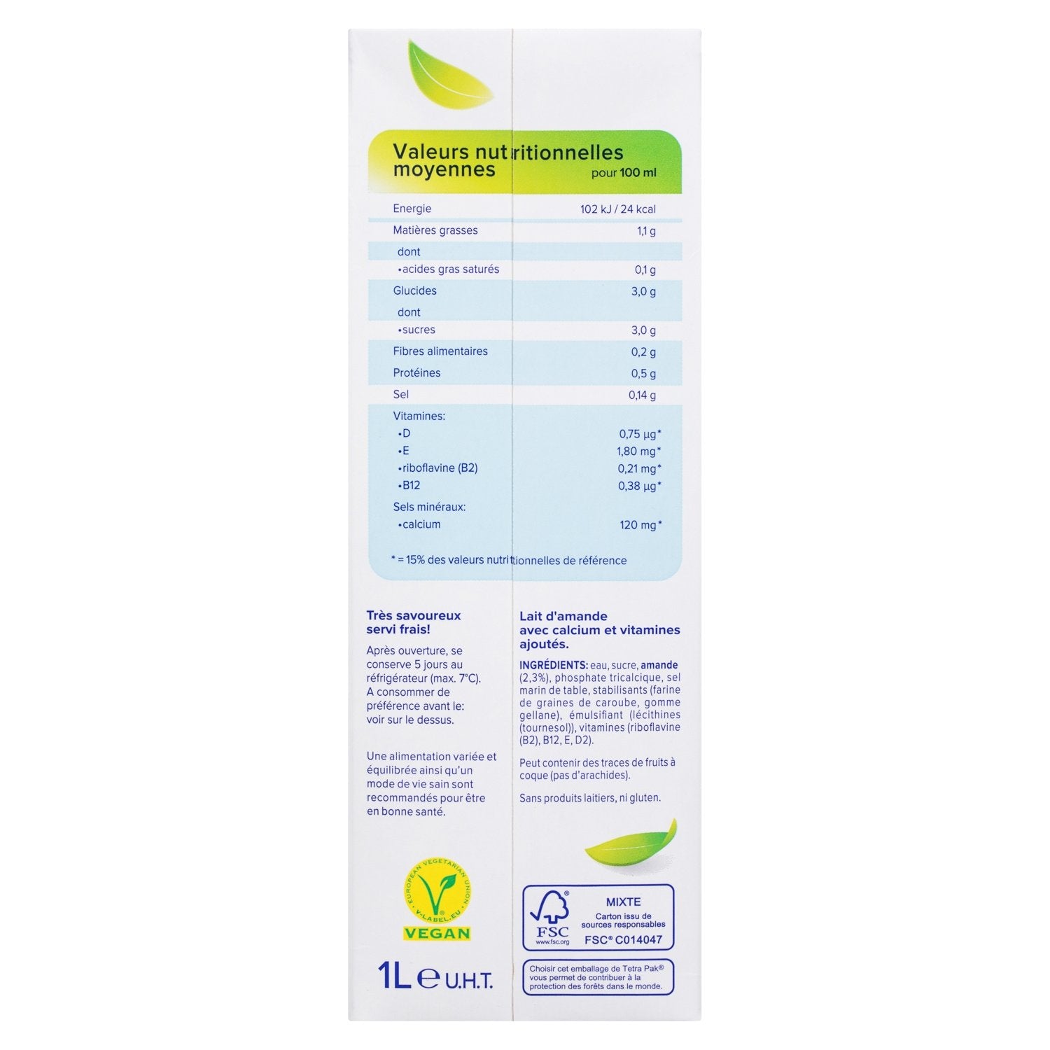 eau, sucre, amande (Espagne) (2,3%), calcium, sel marin de table, stabilisants (farine de graines de caroube, gomme gellane), émulsifiant (lécithines), vitamines (B2, B12, D2, E).