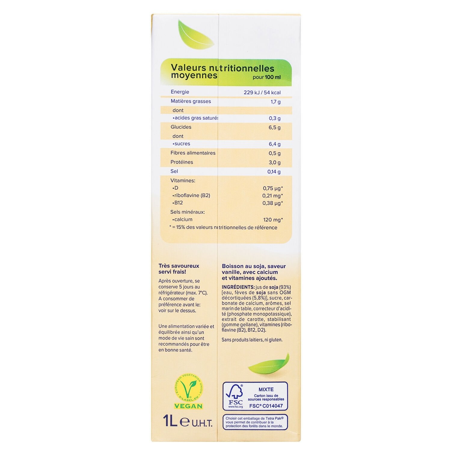 Ingrédients : Ingrédients : jus de SOJA (93%) (eau, fèves de SOJA sans OGM décortiquées (5,8%)) sucre carbonate de calcium arômes sel marin de table correcteur d'acidité (phosphate monopotassique) extrait de carotte stabilisant (gomme gellane) vitamines (riboflavine (B2), B12, D2)