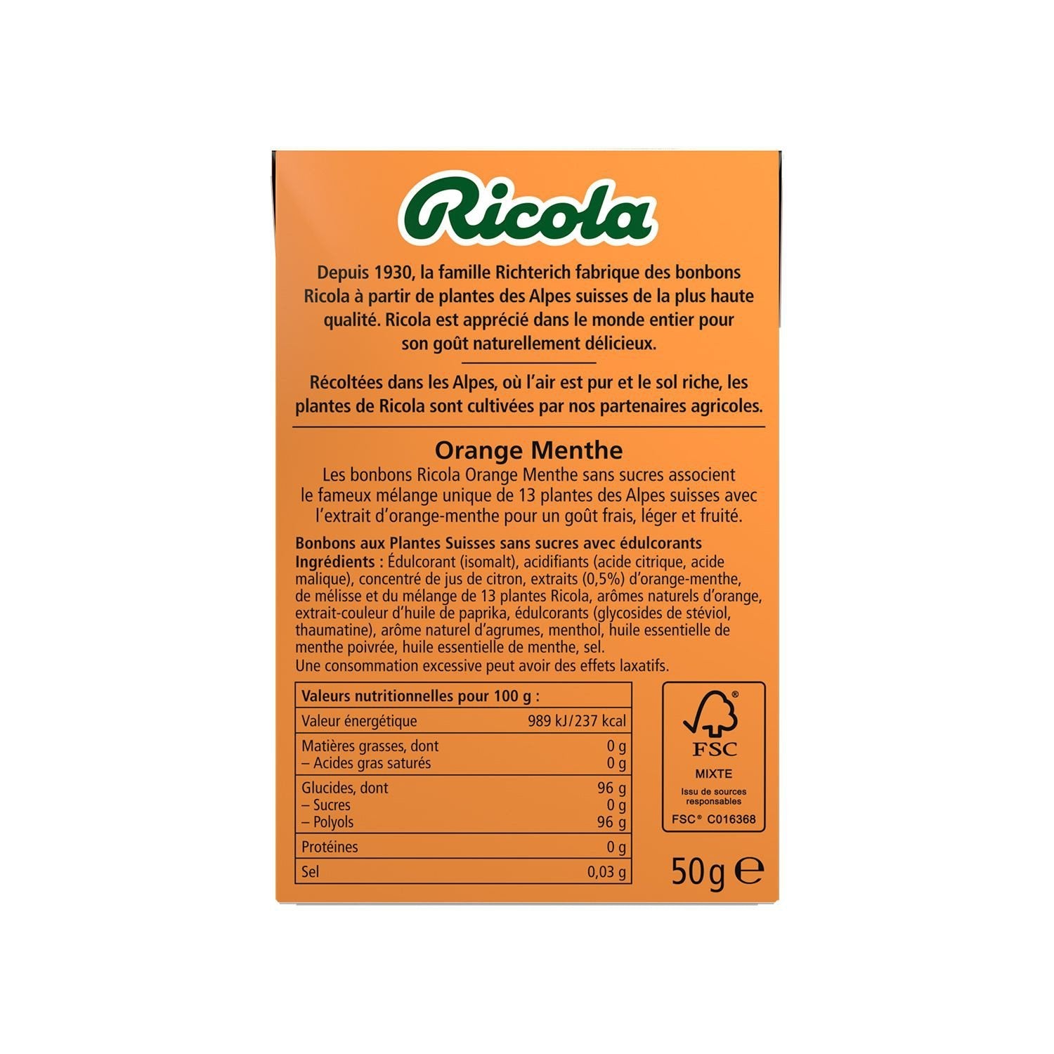 Edulcorant (isomalt), acidifiants (acide citrique, acide malique), concentré de jus de citron, extraits (0.5 %) d'orange-menthe, de mélisse et du mélange de 13 plantes Ricola, arômes naturels d'orange, extrait-couleur d'huile de paprika, édulcorants (glycosides de stéviol, thaumatine), arôme naturel d'agrumes, menthol, huile essentielle de menthe poivrée, huile essentielle de menthe, sel.