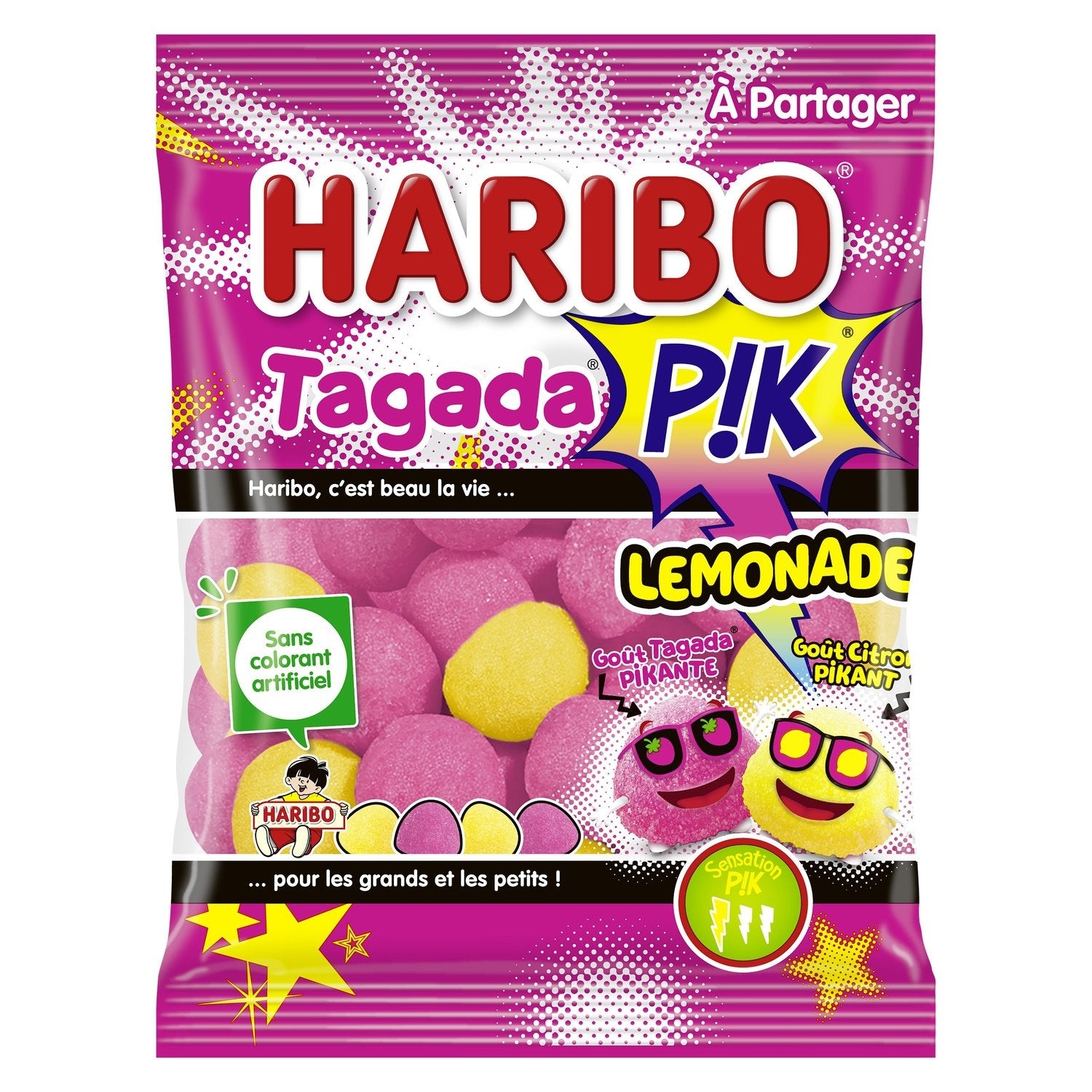 Haribo PIK Tagada est la combinaison parfaite de la forme, du moelleux, et de la texture iconique de Tagada avec la sensation PIK. Un mélange inédit de couleurs et de goûts : la version acidulée Tagada et un nouveau goût frais au citron. HARIBO PIK Tagada est sans colorant artificiel.