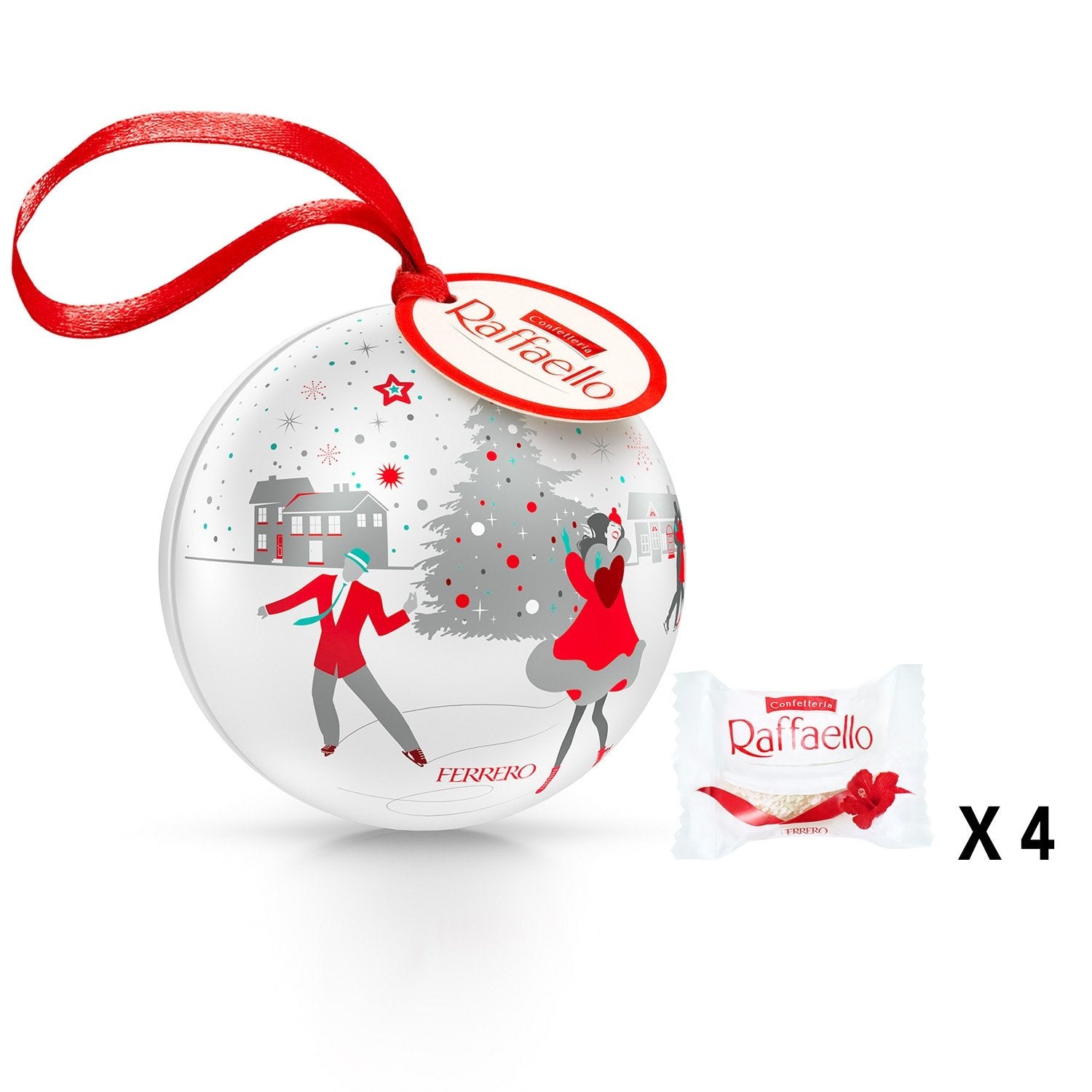 4 Raffaello dans une jolie boule de Noël à accrocher au sapin. Raffaello, c'est un harmonieux mélange d'ingrédients sélectionnés avec soin : une amande croquante, un cœur onctueux et fondant recouvert de fins copeaux de noix de coco. Raffaello, un plaisir délicat.