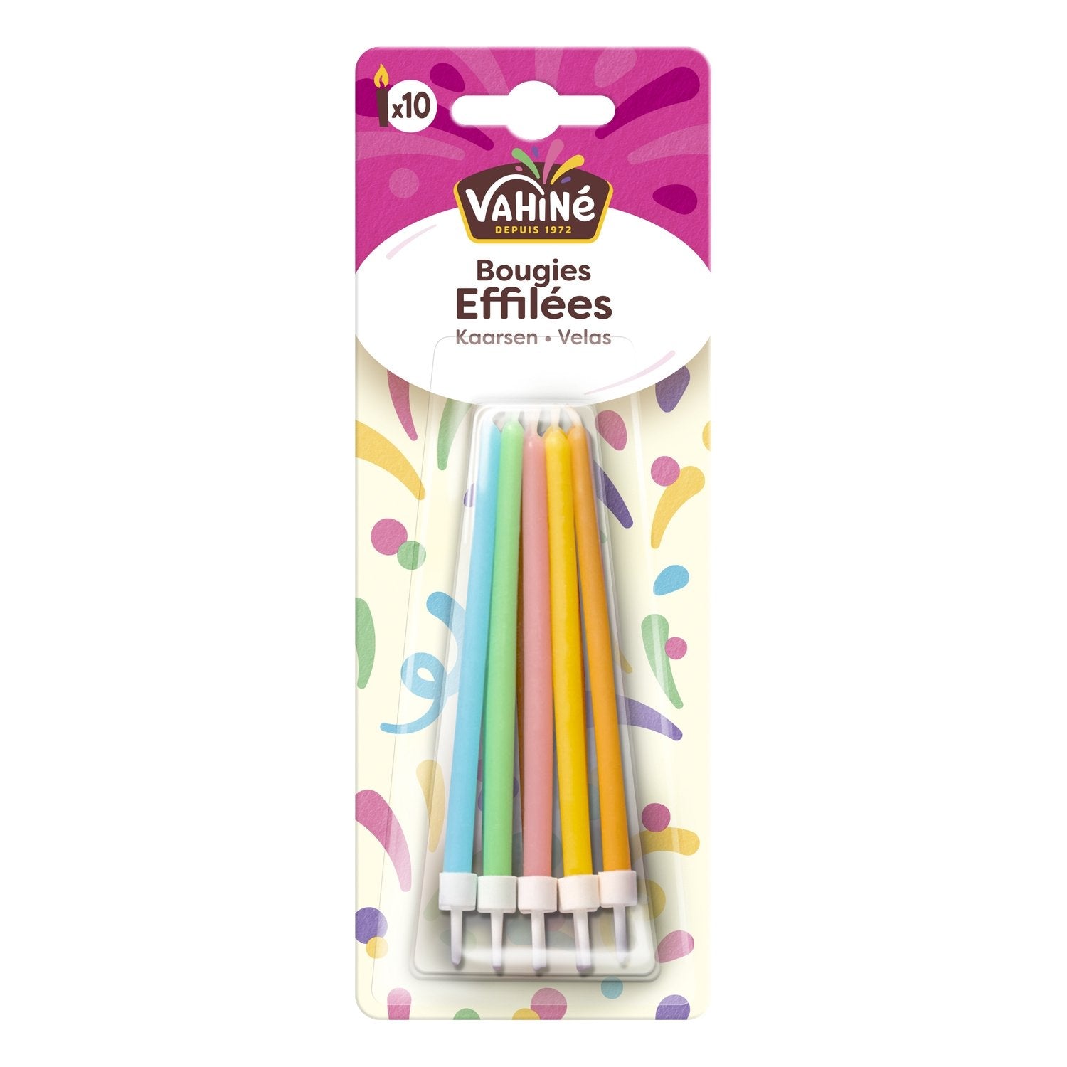 Les cinq bougies effilées Vahiné, avec leur forme allongée et leur couleurs acidulées, sont idéales pour apporter une touche d'élégance et d'originalité à vos gâteaux d'anniversaire !