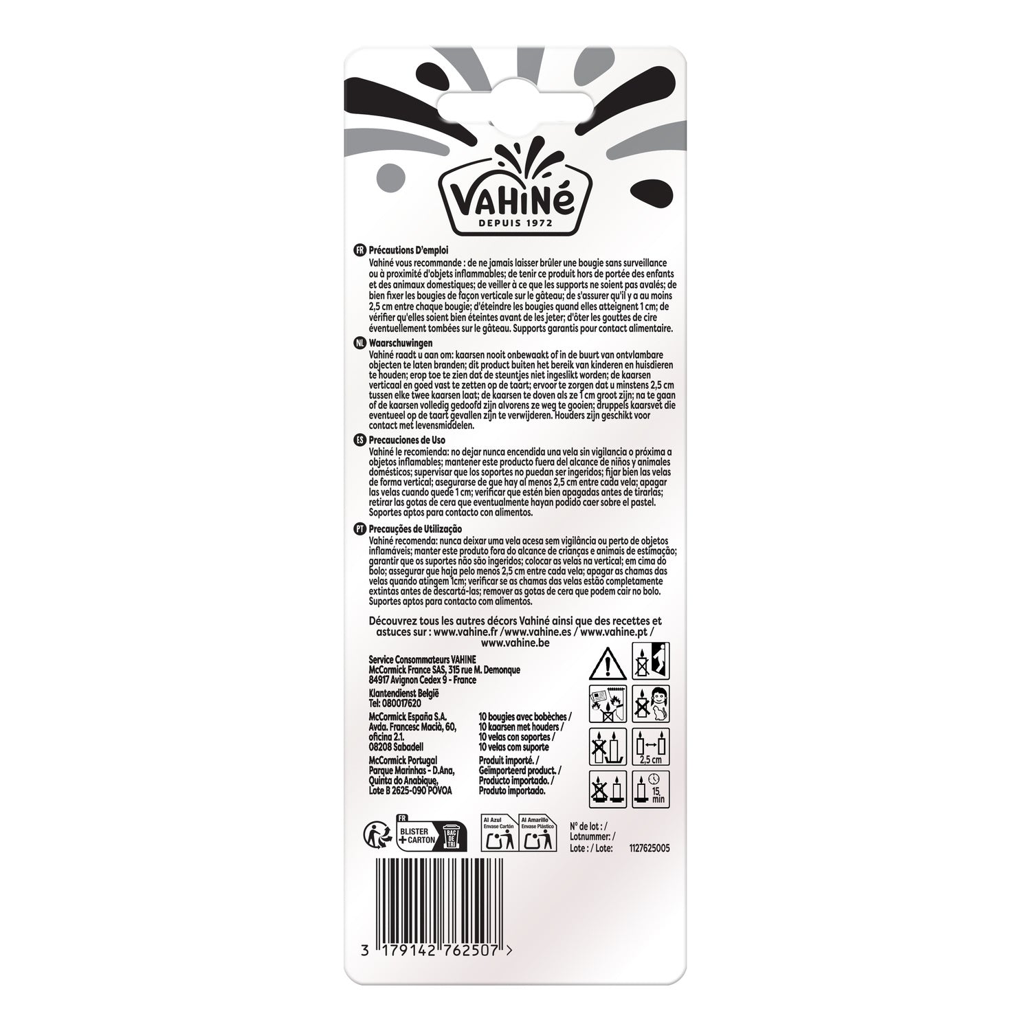 Vahiné vous recommande :- de ne jamais laisser brûler une bougie sans surveillance ou à proximité d'objets inflammables- de tenir ce produit hors de la portée des enfants et des animaux domestiques- de veiller à ce que les supports ne soient pas avalés- de bien fixer les bougies de façon verticale sur le gâteau- de s'assurer qu'il y a au moins 2,5 cm entre chaque bougie- d'éteindre les bougies quand elles atteignent 1 cm- de vérifier qu'elles soient bien éteintes avant de les jeter- d'ôter les gouttes de cire éventuellement tombées sur le gâteau. Supports garantis contact alimentaire.