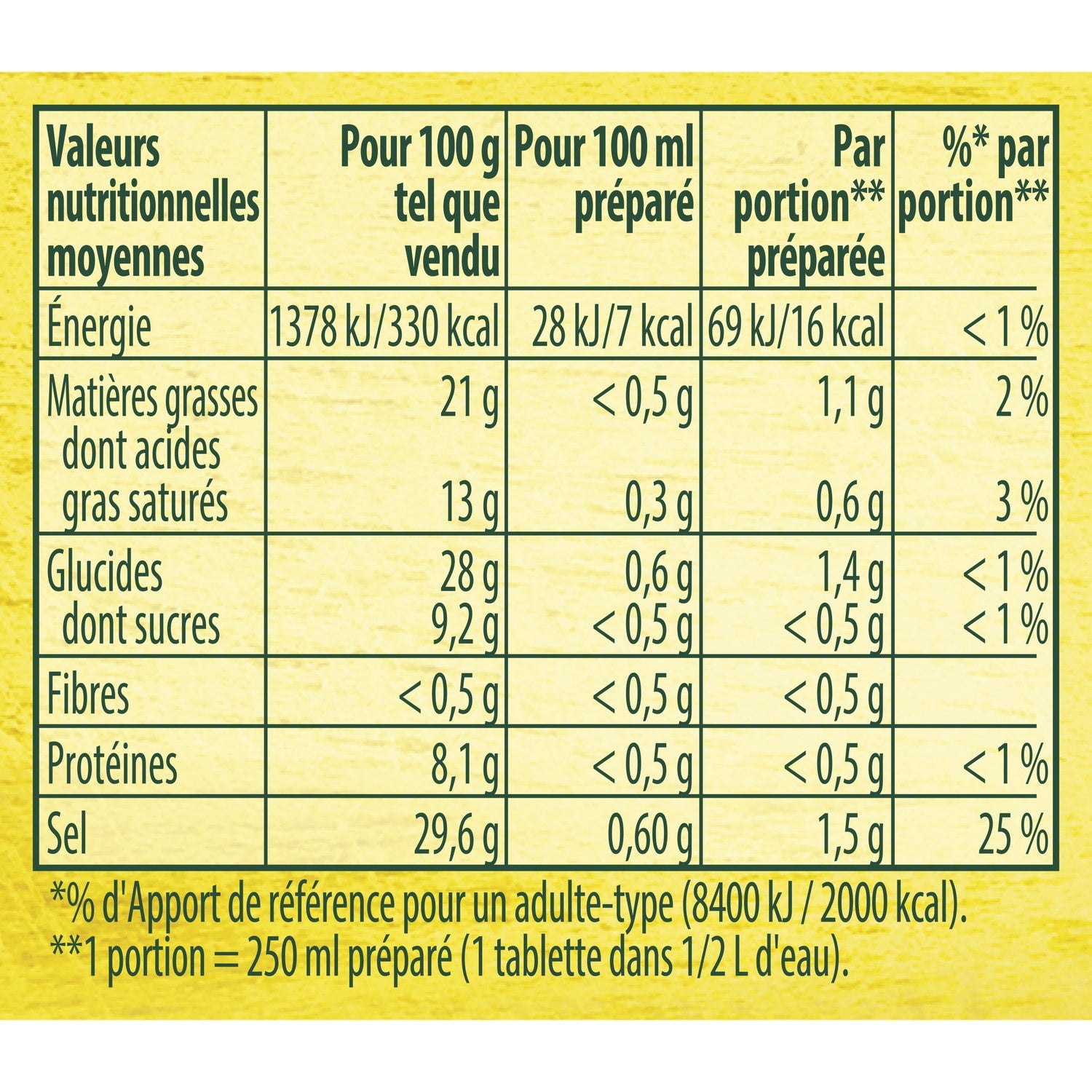Ingrédients : sel, graisses végétales (palme, palme totalement hydrogénée), amidon, exhausteurs de goût : glutamate de sodium, inosinate disodique et guanylate disodique, sucre, arômes, chlorure de potassium, graisse de poule : 3%, viande de poule : 2%, épices et aromates (curcuma², ail², graines de CELERI, persil², poivre), oignon², sirop de caramel, maltodextrine, antioxydant : extraits de romarin. ²Ingrédients issus de l'agriculture durable : 1,4%.
