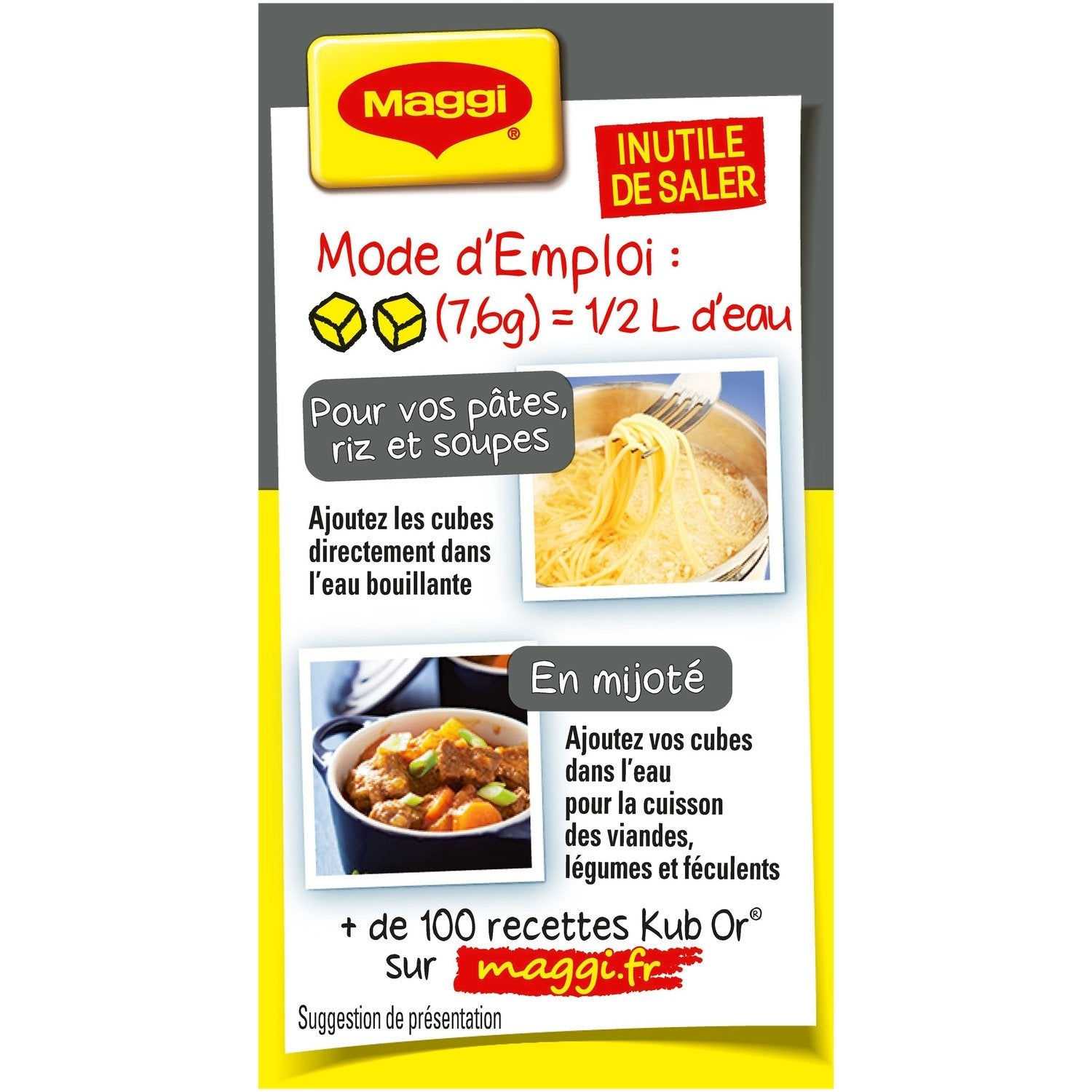 Découvrez le bouillon KUB OR réduit en sel, le goût inimitable de KUB OR de MAGGI avec 25% de sel en moins*. Il vous permettra de rehausser le goût de vos plats en limitant votre apport en sel ! Les recettes MAGGI sont développées avec soin par les chefs cuisiniers MAGGI. En s'inspirant du fait maison, ces cubes de bouillons sont élaborés à partir de viandes et/ou de légumes (selon les recettes), d'épices, d'herbes et de sel. La forme déshydratée de ces ingrédients permet une bonne conservation dans le temps des bouillons. Une fois mélangés, les ingrédients sont compressés dans un moule qui leur donne leur forme de cube : vous n'avez plus qu'à les diluer ou les émietter dans vos préparations pour obtenir des plats encore plus savoureux ! * Par rapport à la moyenne du marché des bouillons hors réduits en sel.