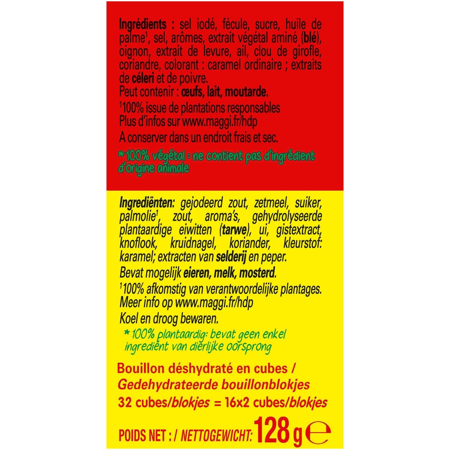 Ingrédients: Sel iodé, fécule, sucre, huile de palme*, sel, arômes, extrait végétal aminé (BLE), oignon, extrait de levure, ail, clou de girofle, coriandre, colorant : caramel ordinaire ; extraits de CELERI et de poivre. *100% issue de plantations responsables. Peut contenir : ŒUFS, LAIT, MOUTARDE.
