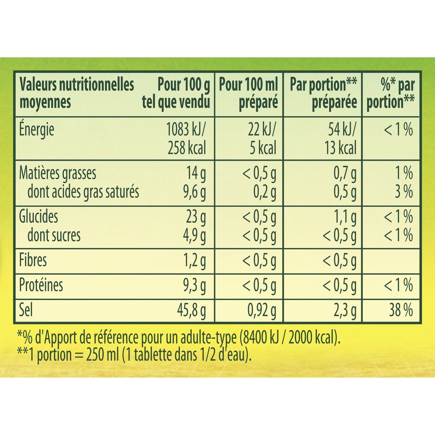 Ingrédients : sel, exhausteurs de goût : glutamate de sodium, inosinate disodique et guanylate disodique, graisse de palme, amidon, maltodextrine, oignon2 : 5,5%, sucre, épices et aromates (ail2, graines de CELERI, poivre, feuilles de laurier2 : 0,1%), extrait de levure, acidifiant : acide citrique, jus de CÉLERI2 concentré, sirop de caramel, bolet2, arôme naturel de livèche, jus de carotte2 concentré, jus de poireau2 concentré, jus d'oignon2 concentré. Peut contenir : avoine, blé, LAIT, MOUTARDE, ŒUF, orge, seigle, SOJA. 2Ingrédients issus de l'agriculture durable : 7%.