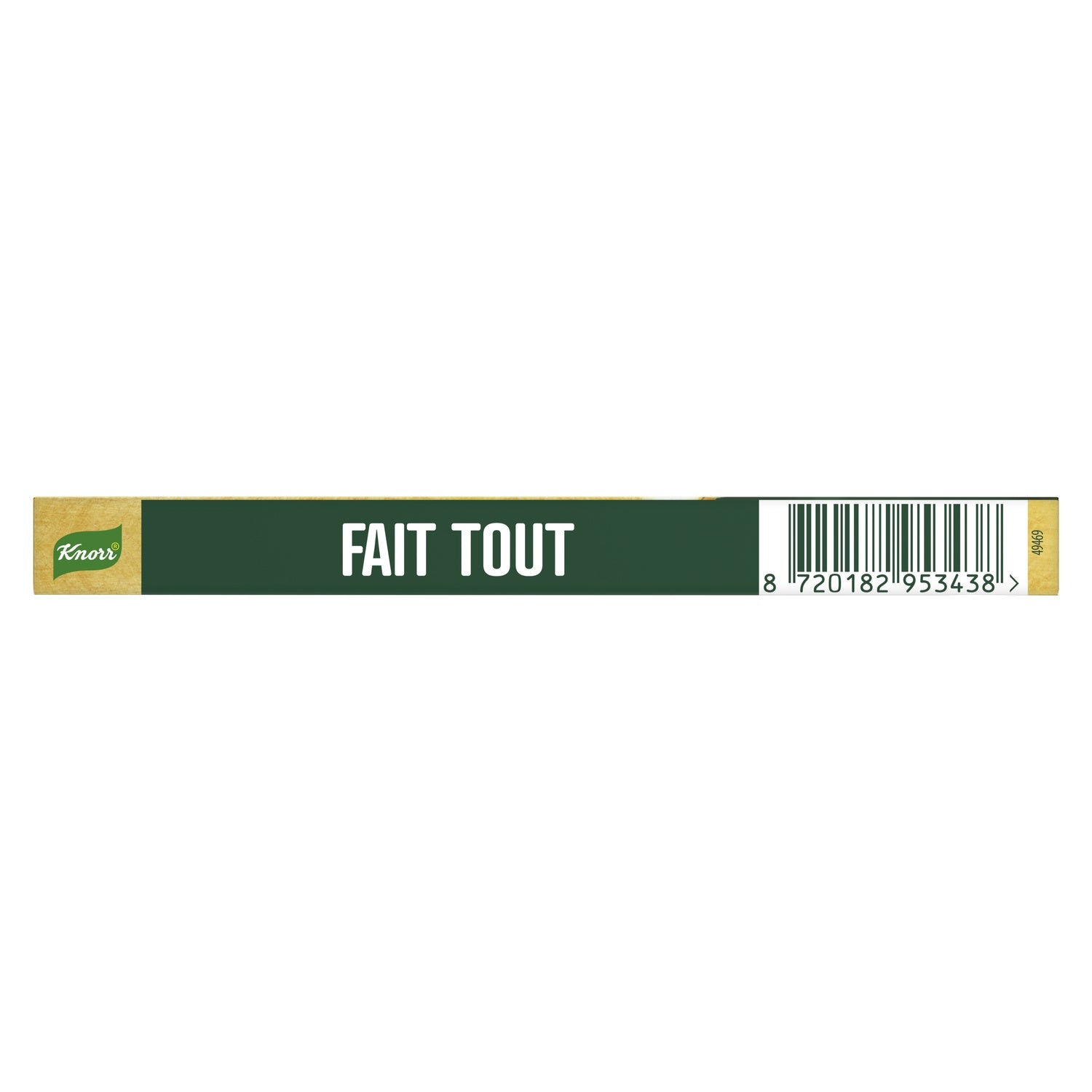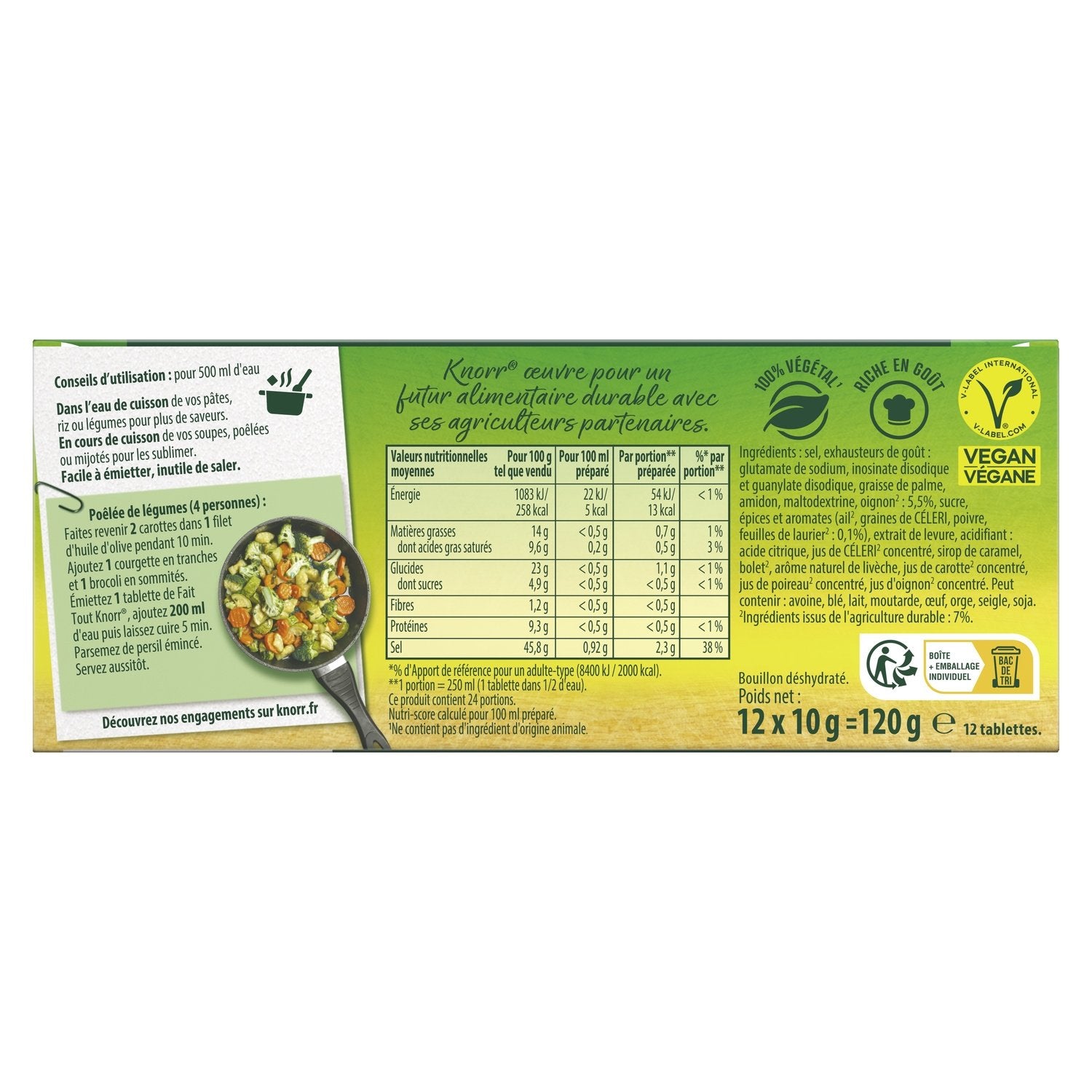 Le bouillon Fait Tout Knorr ®, votre allié idéal pour sublimer tous vos plats au quotidien !,Ce bouillon est idéal pour twister vos poêlées de légumes, soupes maison ou encore pâtes, riz, etc.,100% végétal et riche en goût, ce bouillon est sans conservateur et sans colorant artificiel.,Rapide, simple d'utilisation et facile à émietter, il vous suffit de délayer 1 tablette de bouillon dans 500 ml d'eau frémissante.,Le Bouillon Fait Tout Knorr® est disponible au format 12 tablettes.,Knorr® a développé pour vous une gamme d'aides culinaires et de bouillons permettant de rehausser le goût de vos plats du quotidien.