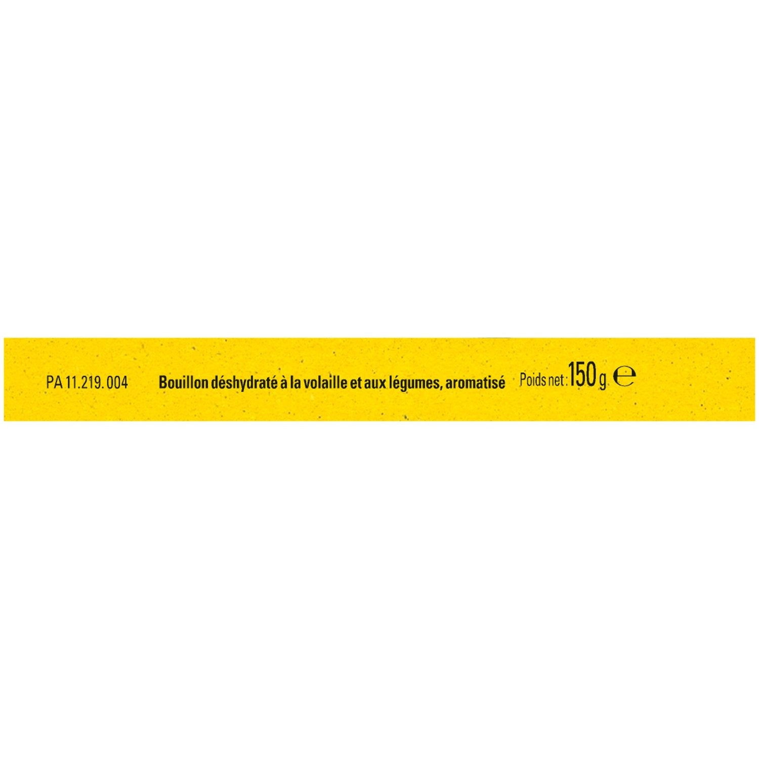 Un bouillon riche en goût et cuisiné avec de la volaille et des légumes savoureux (oignons, carottes, poireaux, navets).,Une nouvelle recette améliorée pour un produit simplement bon. Volaille élevée en plein air et ingrédients de qualité. Sans huile de palme.,Idéal pour rehausser en un instant le goût de vos plats comme vos viandes blanches, vos consommés ou vos légumineuses.