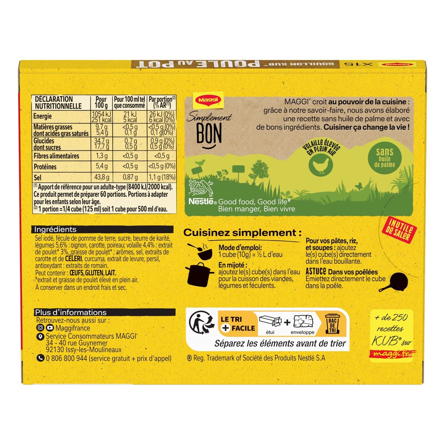 Découvrez le bouillon KUB Poule au Pot de MAGGI ! Une recette riche en goût, préparée à partir de volaille élevée en plein air et de légumes savoureux (oignons, carottes, poireaux, navets) qui rehaussera en un instant vos viandes blanches, vos consommés, vos légumineuses ou vos poêlées de légumes, en leur donnant un bon goût de volaille cuisinée et de légumes. Recette avec de bons ingrédients et sans huile de palme.