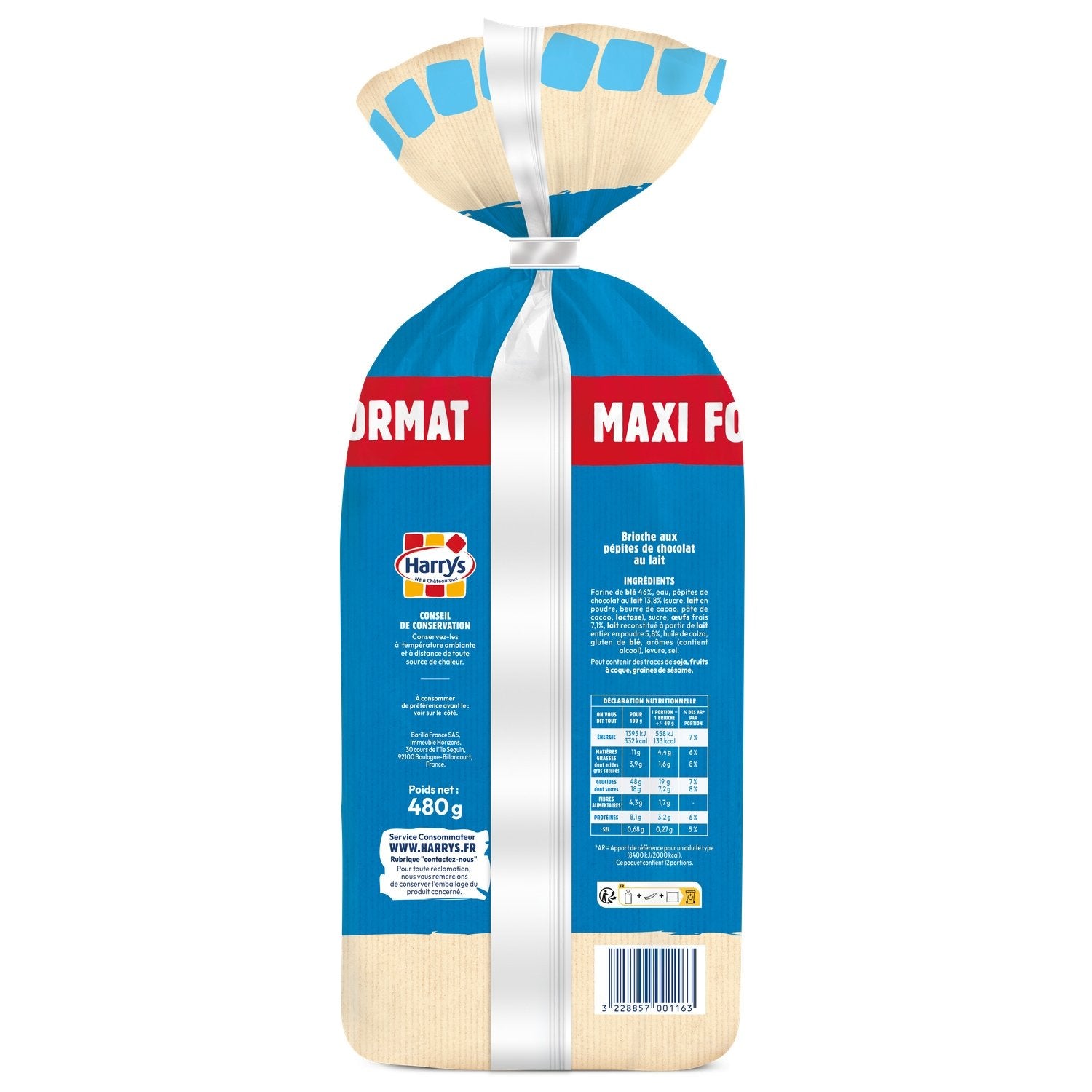 Farine de BLÉ 46%, eau, pépites de chocolat au LAIT 13,8% (sucre, LAIT en poudre, beurre de cacao, pâte de cacao, LACTOSE), sucre, OEUFS frais 7,1%, LAIT reconstitué à partir de LAIT entier en poudre 5,8%, huile de colza, GLUTEN DE BLE, arômes (contient alcool), levure, sel. Peut contenir des traces de SOJA, FRUITS A COQUE, GRAINES DE SESAME.
