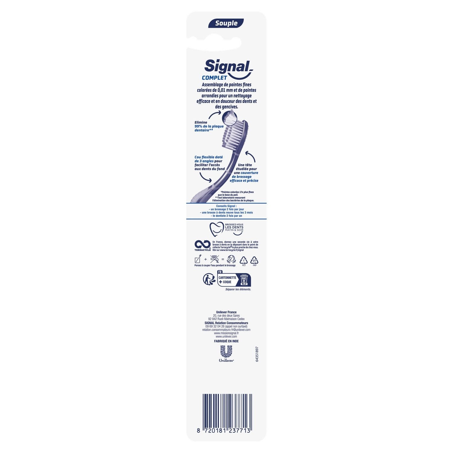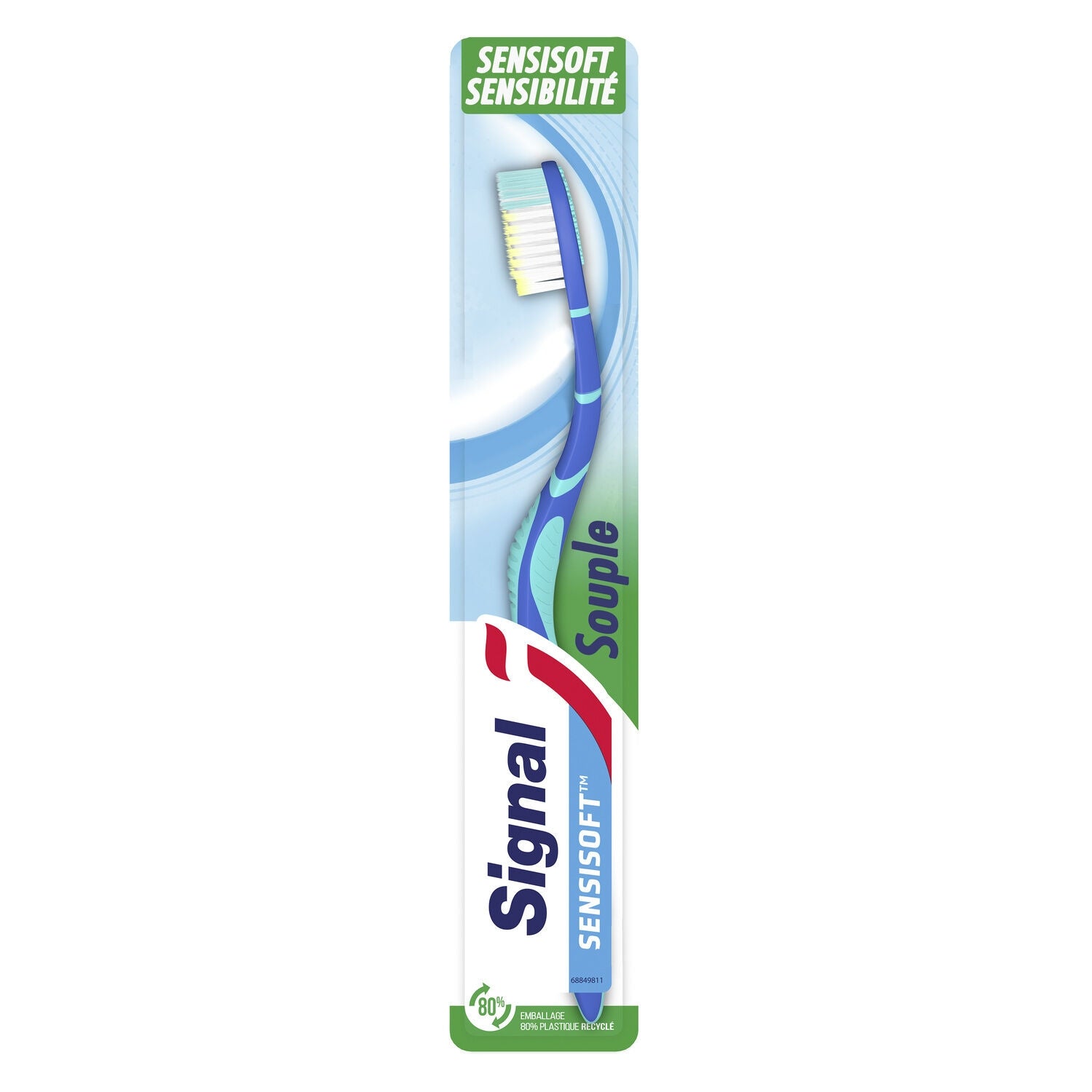 Les brosses à dents Signal Sensisoft souples sont dédiées à la douceur du brossage et au soin des gencives.,La gamme est composée de 3 brosses à dents : Complet, Charbon et Sensibilité.,Un cou flexible doté de 3 angles pour faciliter l'accès aux dents du fond et une tête étudiée pour une couverture de brossage efficace et précise.,L'assemblage de pointes fines colorées de 0,01 mm et de pointes arrondies de la brosse à dents Sensisoft Complet permet un nettoyage efficace et en douceur des dents et des gencives.,La brosse à dents Sensisoft Complet élimine 99 % de la plaque dentaire**,Signal recommande un brossage deux fois par jour, une brosse à dents neuve tous les 3 mois, et une visite chez le dentiste deux fois par an.