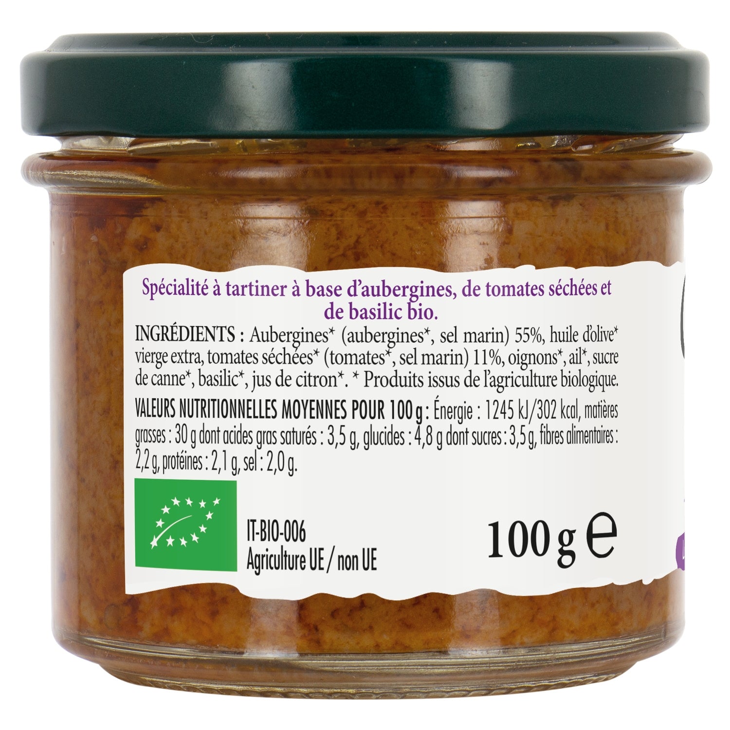 Spécialité à tartiner à base d'aubergines, de tomates séchées et de basilic bio.