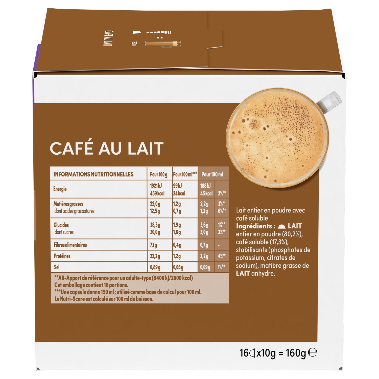 L'association équilibrée d'un café intense et du lait onctueux dans une capsule, à déguster idéalement dans un mug (180ml),L'intensité du café 100% Robusta répond à la douceur crémeuse du lait pour créer une tasse harmonieuse et équilibrée, avec des notes de caramel et de céréales grillées et une texture ronde.,La fraîcheur du café est préservée dans une capsule hermétique pour profiter des arômes à chaque tasse,16 capsules pour 16 tasses de NESCAFE Dolce Gusto Café au Lait