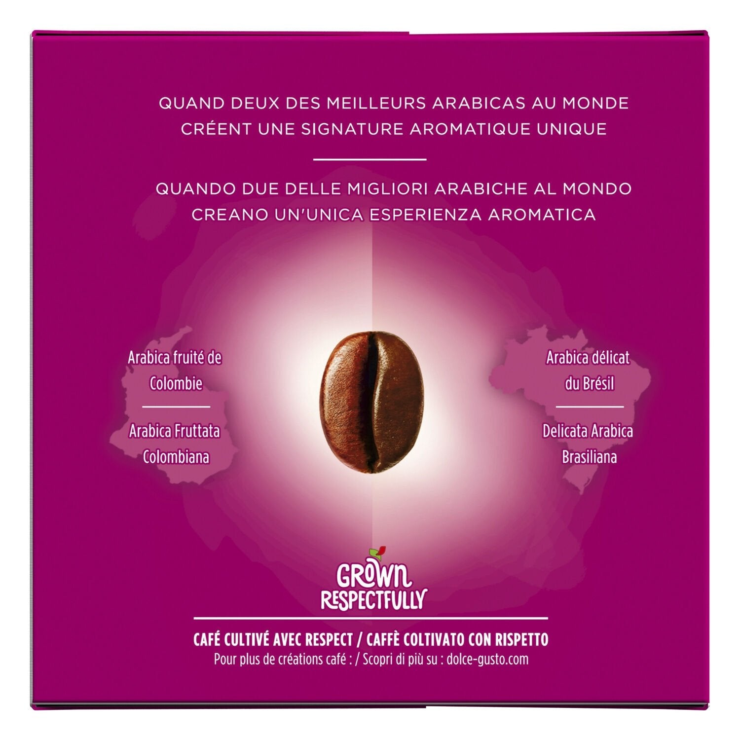 Un café court élégant et légèrement torréfié 100 % Arabica intensité 5/11,Un café doux et rond, aux arômes fruités et subtils avec des notes de noix grillées. Son corps est délicat, sa crema* est dense et dorée,Un mélange 100% Arabica de deux grains originaires d'Amérique du Sud, légèrement torréfiés pour révéler la subtilité de leurs arômes,La capsule hermétique conserve la fraîcheur et les arômes de ce café,La boîte contient 16 capsules conçues pour les machines à café NESCAFE DOLCE GUSTO et vous permet de préparer 16 tasses d'Espresso,*Crema = Mousse de café