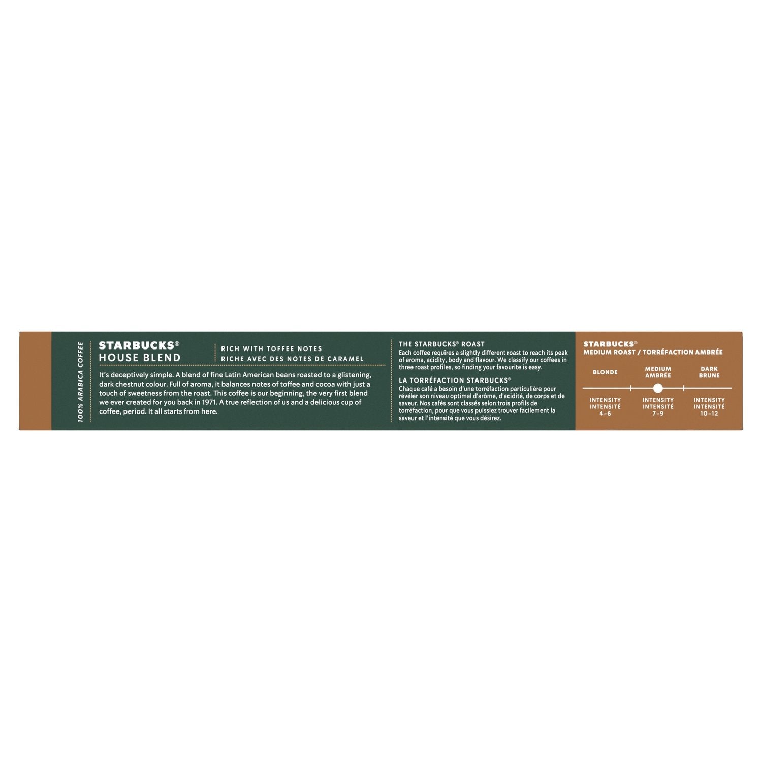 Découvrez les capsules STARBUCKS House Blend by NESPRESSO, un café long 100% pur Arabica à préparer chez vous avec votre machine NESPRESSO. Subtilement complexe, cet assemblage est composé de fèves délicates d'Amérique latine, torréfiées jusqu'à l'obtention d'une robe chatoyante couleur châtaigne. Riche en saveurs, ce café maîtrise l'équilibre des parfums de noisettes et de cacao. Un format boîte contenant 10 capsules vous permet de préparer 10 tasses de café STARBUCKS House Blend. Intensité 8.
