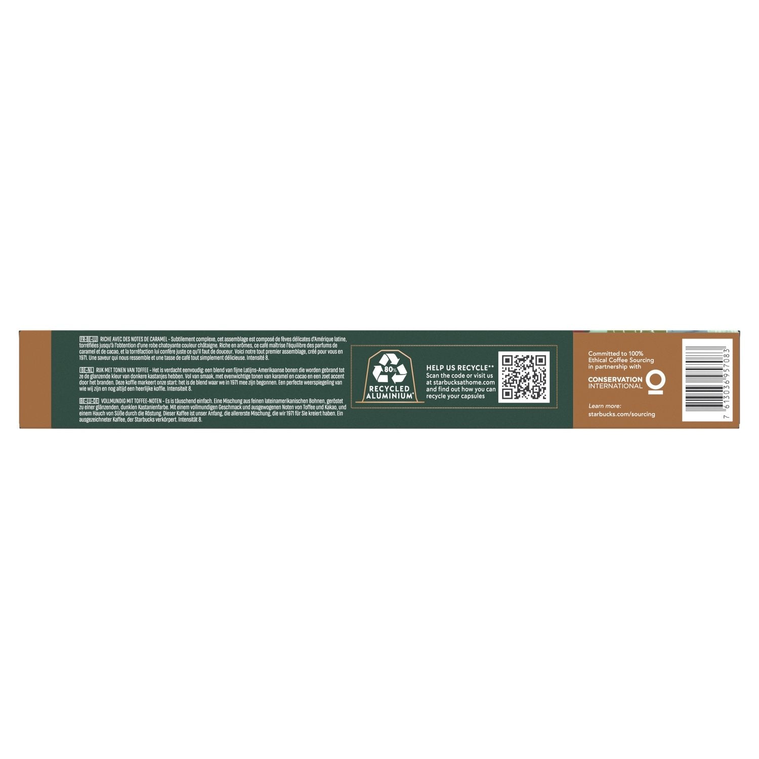 Café 100% pur Arabica.,Capsules de café intense avec des notes de caramel.,Torréfaction ambrée : ni trop doux, ni trop forts, nos cafés à torréfaction ambrée sont bien équilibrés, pour une valeur sûre tout au long de la journée.,Retrouvez votre café STARBUCKS maintenant chez vous en capsules.,Votre café passe par de nombreuses étapes. Une équipe d'experts STARBUCKS se procure, torréfie et assemble du café de haute qualité provenant de diverses régions du monde entier, pour des dégustations chez vous ou dans l'un de nos salons de café.,Dès ces débuts, STARBUCKS choisit d'être une entreprise différente qui non seulement célébre le café mais favorise aussi les rapports humains. Notre mission : inspirer et enrichir l'esprit au gré des rencontres, café après café.