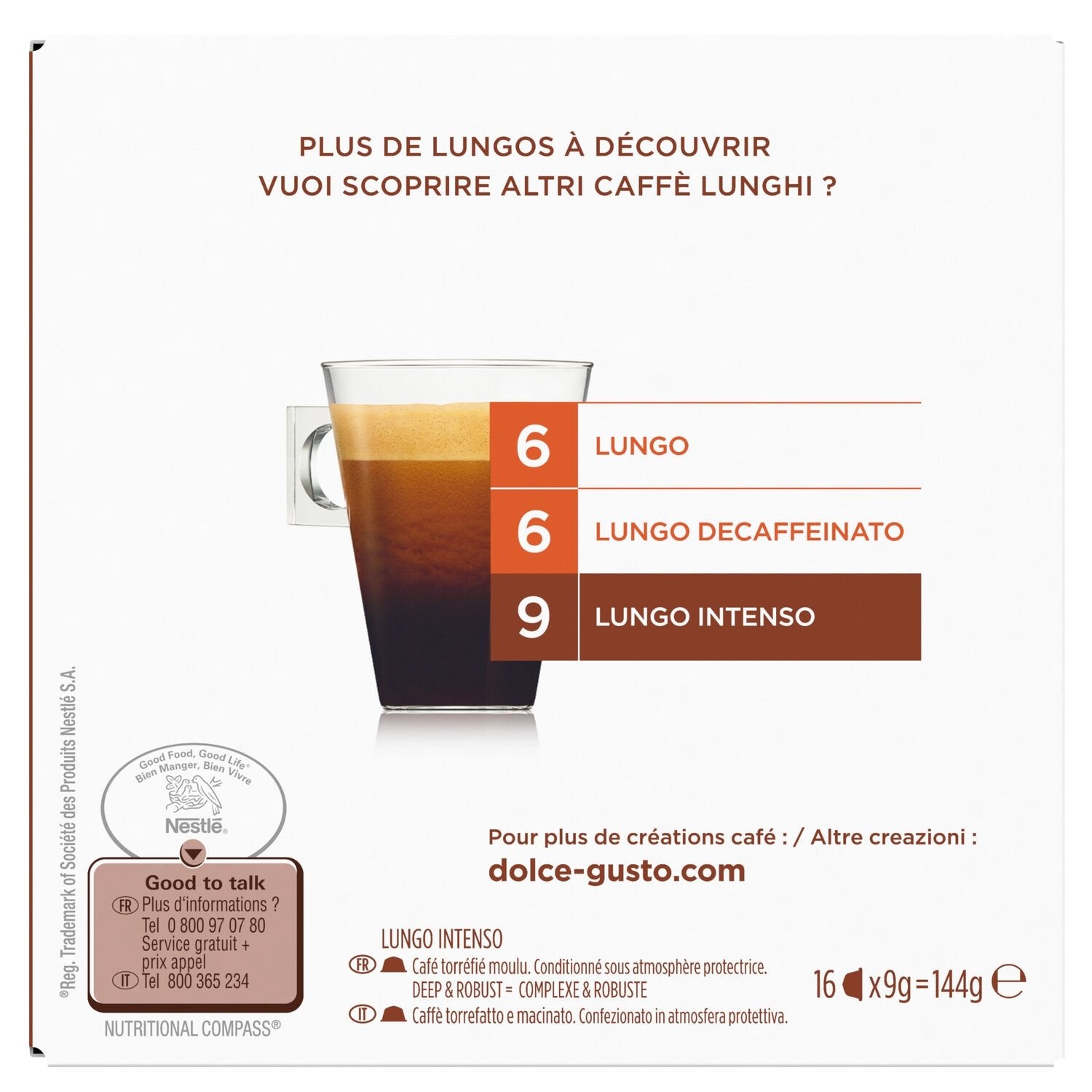 Découvrez Lungo Intenso NESCAFE Dolce Gusto, un café à la torréfaction poussée, rond, intense et corsé. Avec une intensité de 9, Lungo Intenso offre toute la puissance et le caractère d'un espresso dans un format allongé (120ml), surmonté d'une crema* riche. Nos créateurs de café ont associés l'intensité du Robusta du Vietnam au caractère corsé des grains d'Arabica du Brésil. En utilisant des grains de café Arabica et Robusta, nous avons obtenu la parfaite combinaison d'arômes, de richesse et de corps. Grâce à nos capsules hermétiquement scellées qui préservent la fraîcheur du café, vous apprécierez une richesse aromatique incomparable à chaque tasse. *crema = mousse de café