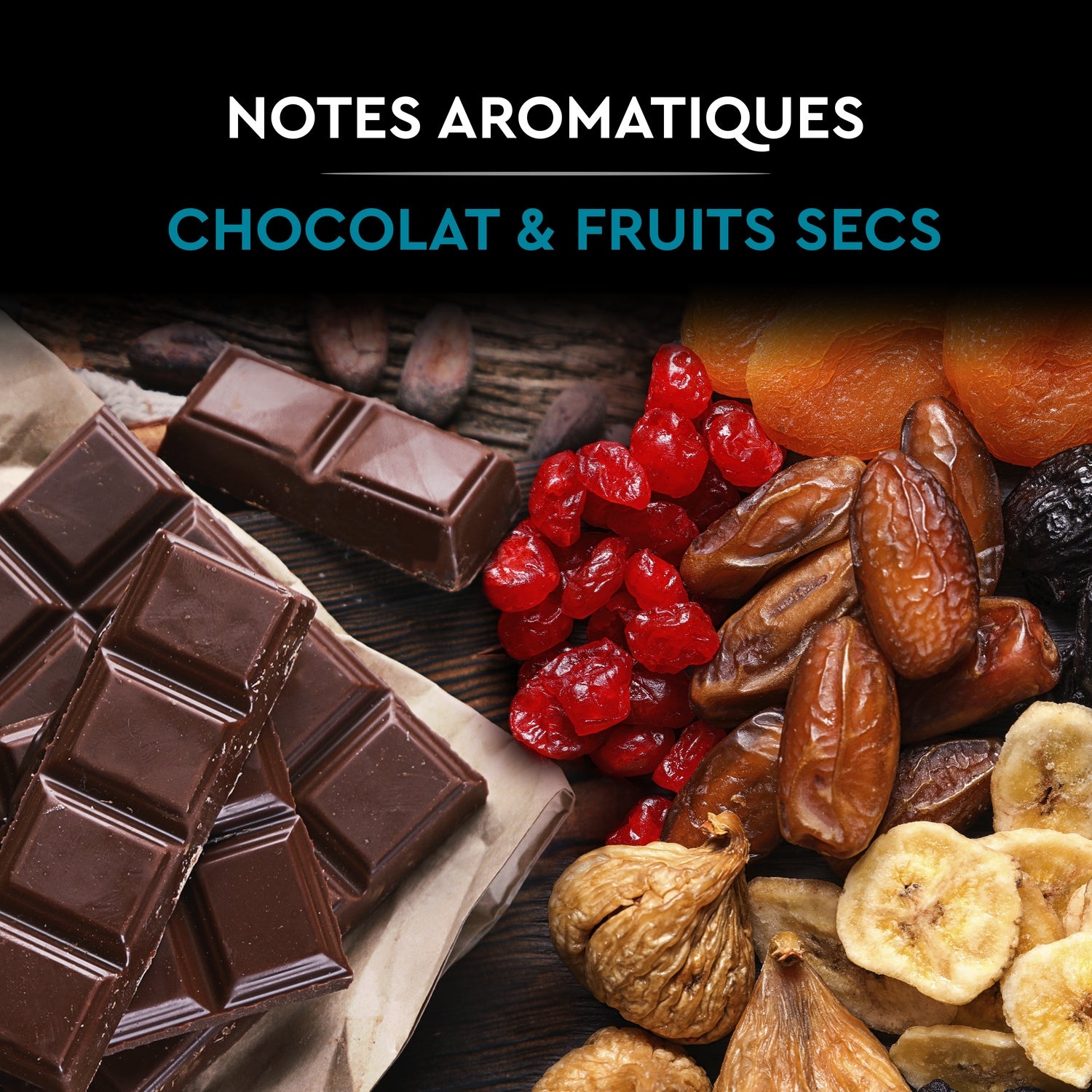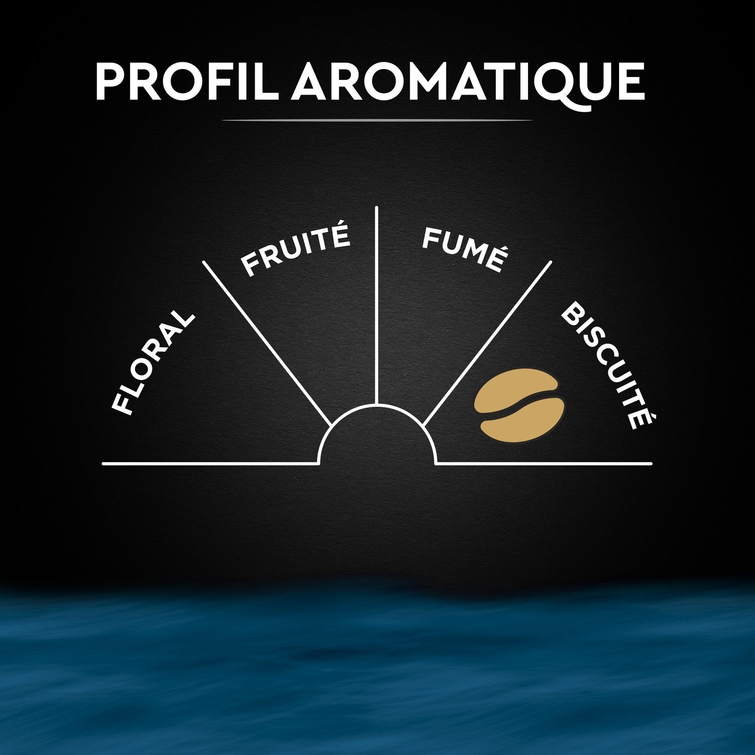 Variété : Pur Arabica Profil aromatique : Biscuité Torréfaction : Ambrée Notes : Chocolat et Fruits secs Intensité 7/10