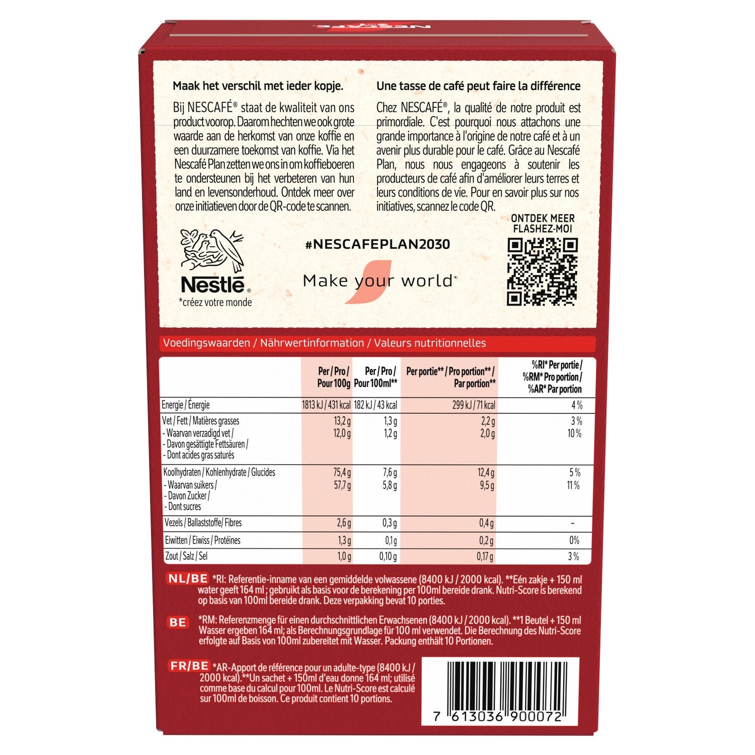 Boisson instantanés au bon goût de café au lait sucré.,Café au lait sucré onctueux.,Café au format stick, pratique pour un dosage parfait.,Depuis 2010, NESCAFÉ œuvre pour proposer un café issu d'un approvisionnement plus responsable.,Café au lait instantané disponible en sticks.,NESCAFÉ est la marque de café n°1, appréciée dans plus de 180 pays. Avec ses 80 ans d'expérience dans la sélection, l'assemblage et la torréfaction des meilleurs grains de café, c'est 5 500 tasses de café NESCAFÉ bues chaque seconde dans le monde !