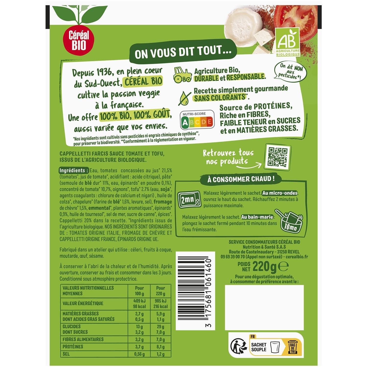 Eau, tomates concassée au jus* 21,5% (tomates*, jus de tomate*, acidifiant : acide citrique), pâte* (semoule de BLE dur*11%, eau, épinards* en poudre 0,1%), concentré de tomate* 10,7%, oignons*, tofu*2.7% (eau, SOJA*, agents coagulants : chlorure de calcium et nigari) , huile de colza*, chapelure* (farine de BLE* 1.6%, levure, sel), FROMAGE de chèvre* 1,5%, EMMENTAL*, plantes aromatiques*, épinards* 0,9%, , huile de tournesol*, sel de mer, sucre de canne*, épices*. Cappelletti 20% dans la recette. * Ingrédients issus de l'agriculture biologique Fabriqué dans un atelier qui utilise CELERI, FRUITS A COQUE, MOUTARDE, OEUF, SESAME