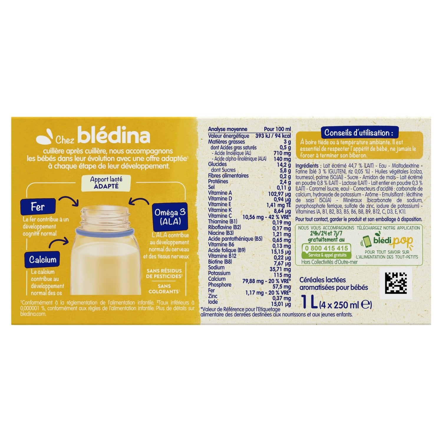 4 briques prêtes à l'emploi. Afin de promouvoir un régime varié, nos experts recommandent la consommation de céréales au biberon une seule fois par jour.