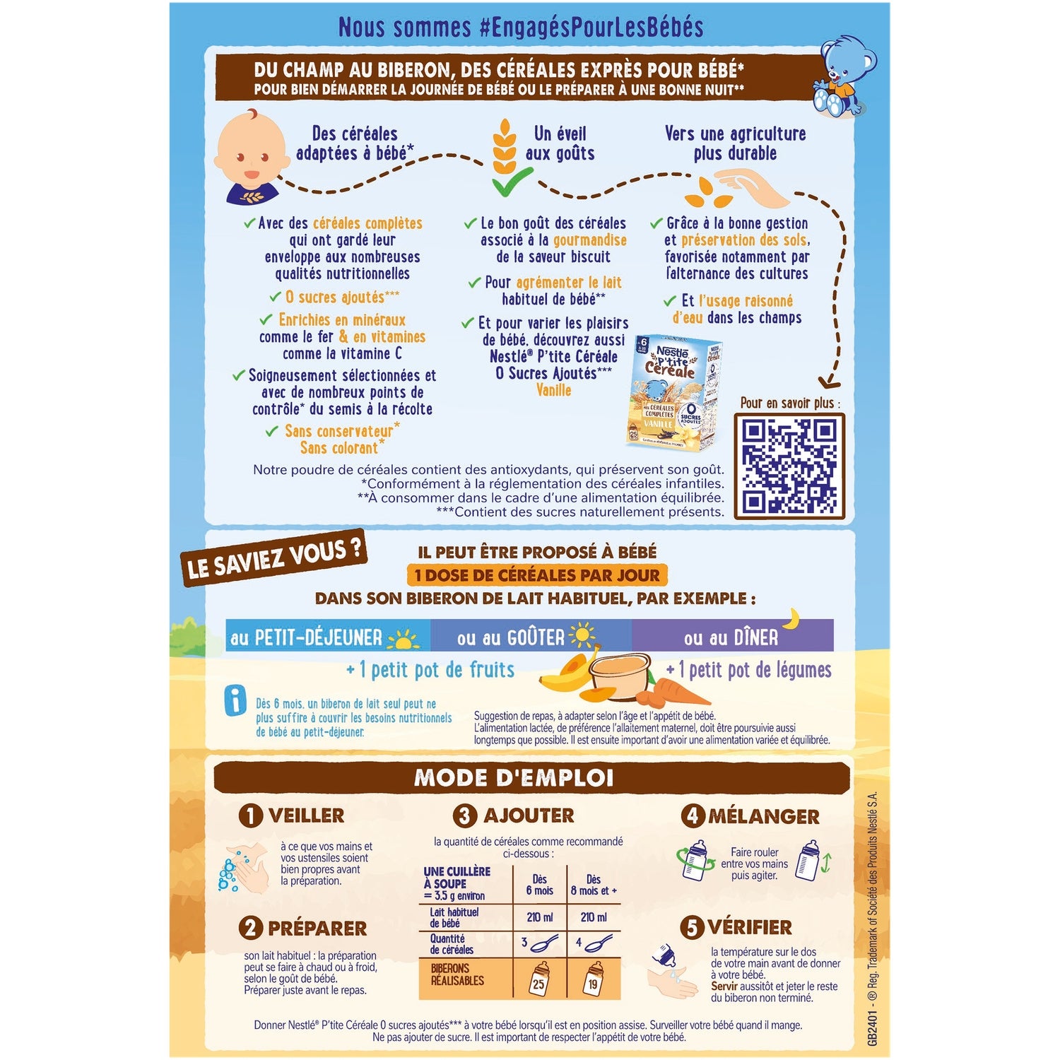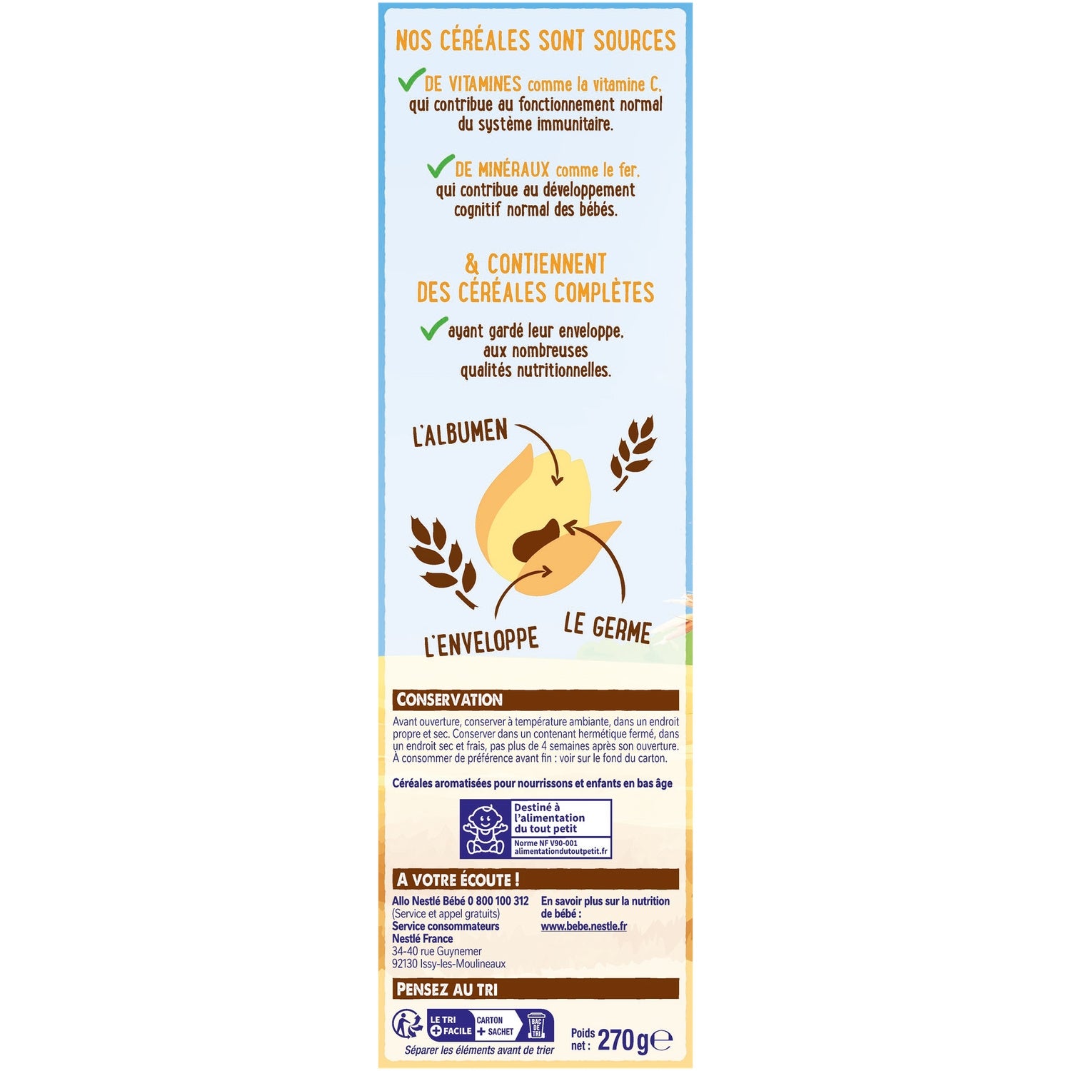 0 sucres ajoutés*.,Exprès pour bébé**.,Aux céréales complètes.,Enrichies en minéraux et vitamines .,*Contient des sucres naturellement présents.,**Conformément à la réglementation sur les céréales infantiles.