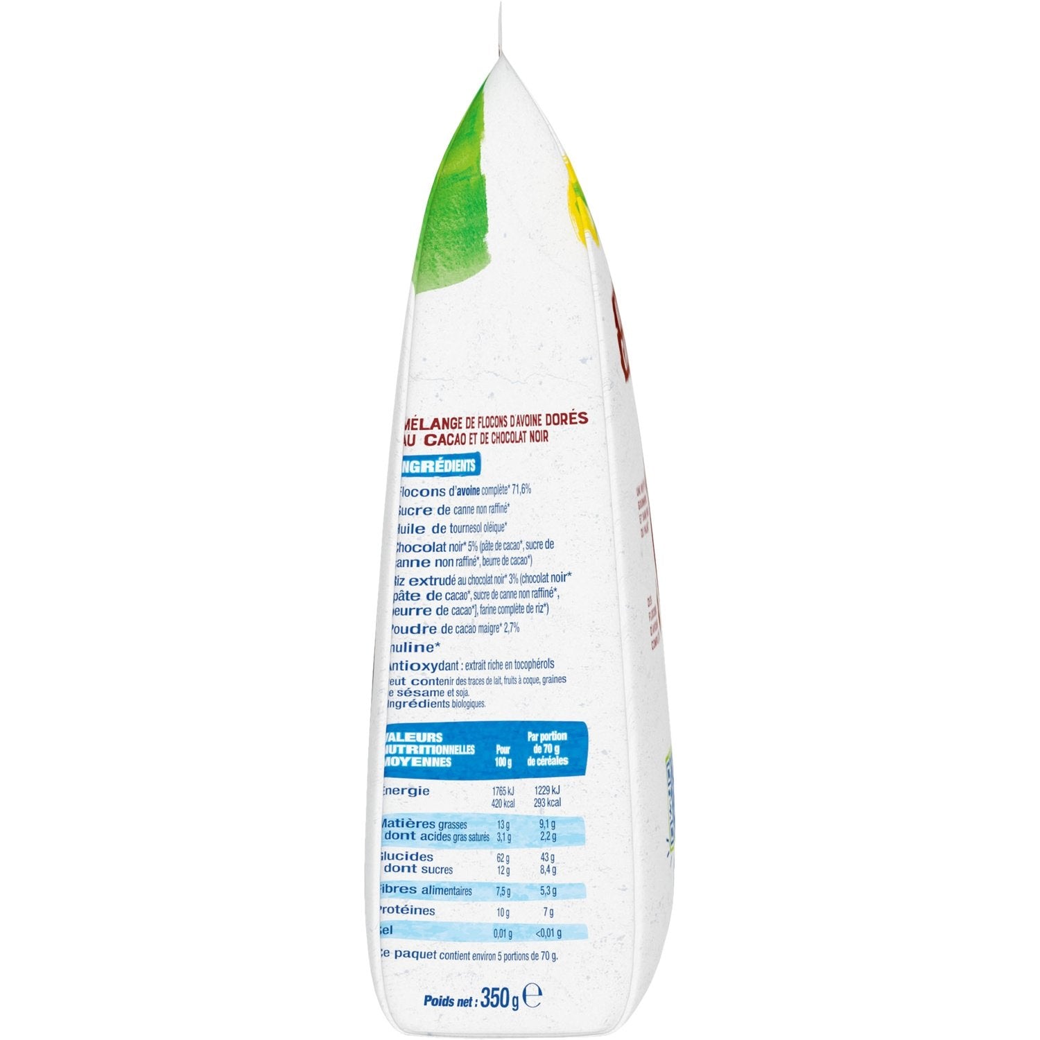 Flocons d'avoine compléte* 71%, sucre de canne non raffiné*, huile de tournesol oléique*, chocolat noir* 5% (pâte de cacao*, sucre de canne non raffiné*, beurre de cacao*), riz extrudé au chocolat noir* 3% (chocolat noir* pâte de cacao*, sucre de canne non raffiné*, beurre de cacao*, farine complète de riz*), poudre de cacao maigre* 2,5%, inuline*, antioxydant : extrait riche en tocophérols.