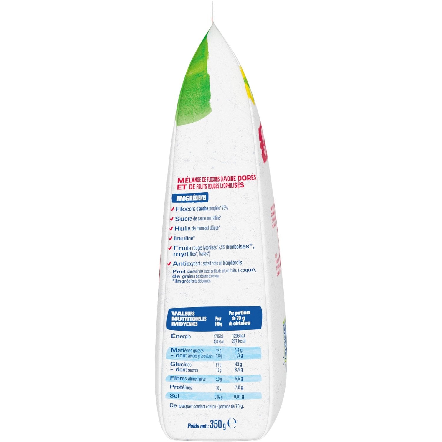 Flocons d'avoine complète* 75 %, sucre de canne non raffiné*, huile de tournesol oléique*, inuline*, fruits rouges lyophilisés* 2,5 % (framboises*, myrtilles*, fraises*), antioxydant : extrait riche en tocophérols.