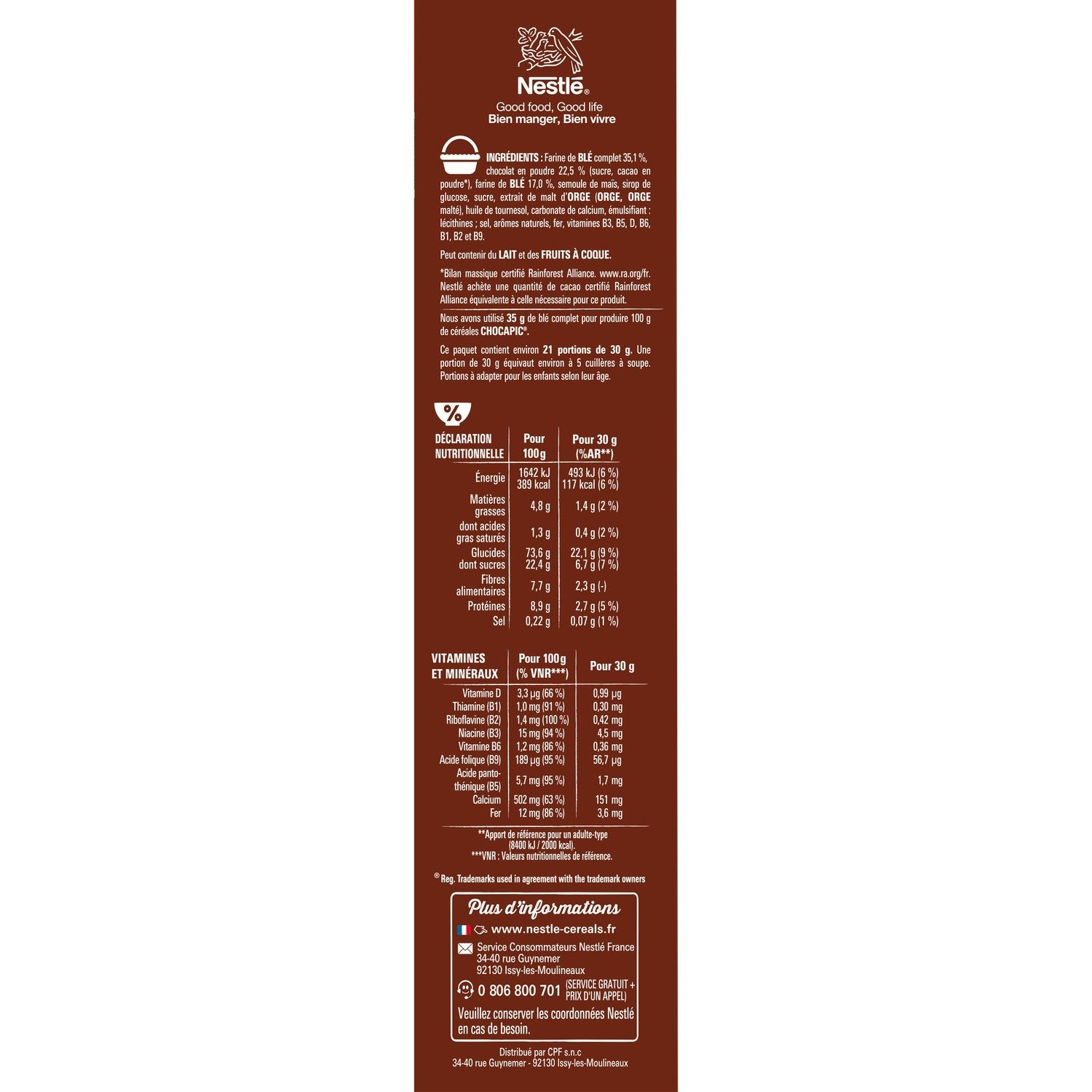 Ingrédients : Farine de BLÉ complet 35,1 %, chocolat en poudre 22,5 % (sucre, cacao en poudre*), farine de BLÉ 17,0 %, semoule de maïs, sirop de glucose, sucre, extrait de malt d'ORGE (ORGE, ORGE malté), huile de tournesol, carbonate de calcium, émulsifiant : lécithines ; sel, arômes naturels, fer, vitamines B3, B5, D, B6, B1, B2 et B9. Peut contenir du LAIT et des FRUITS A COQUE. *Bilan massique certifié Rainforest Alliance. www.ra.org/fr. Nestlé achète une quantité de cacao certifié Rainforest Alliance équivalente à celle nécessaire pour ce produit.