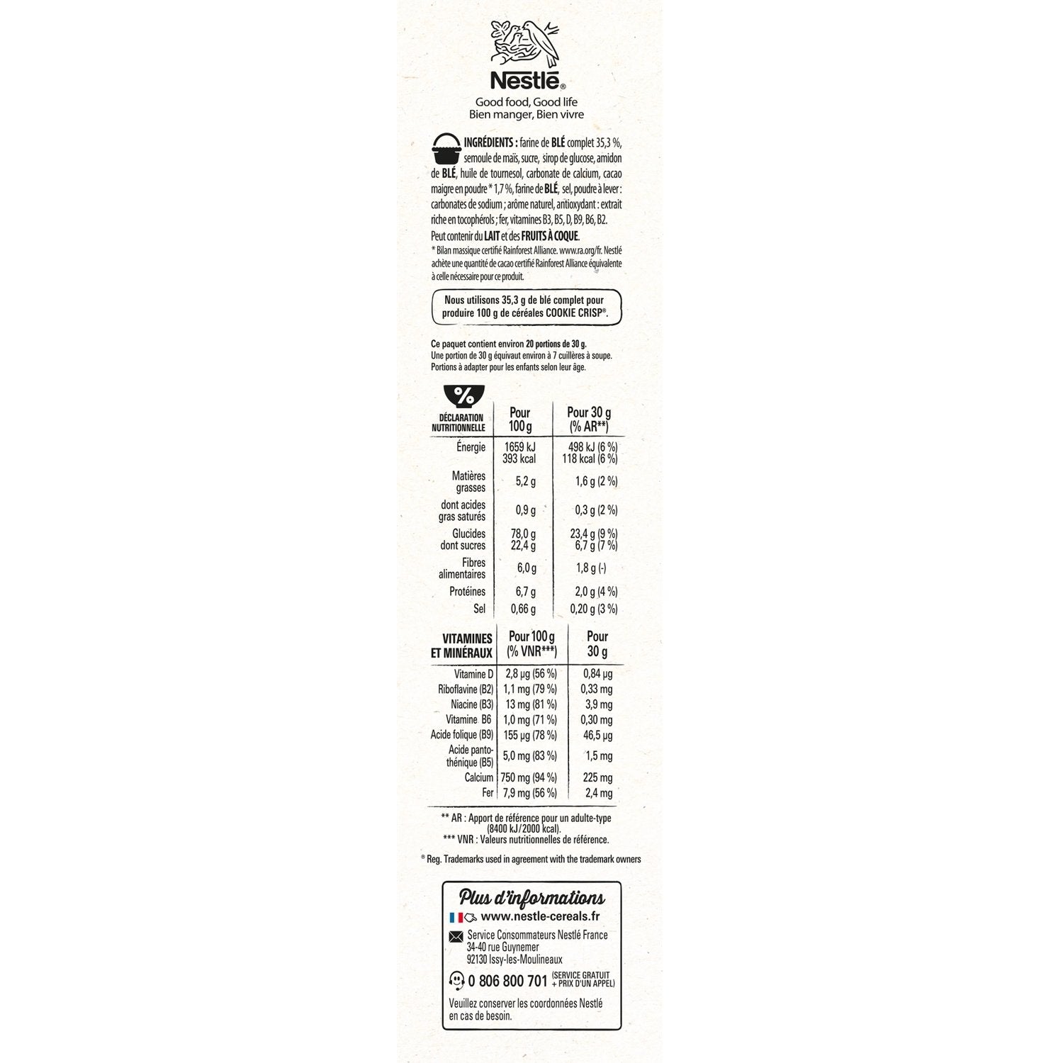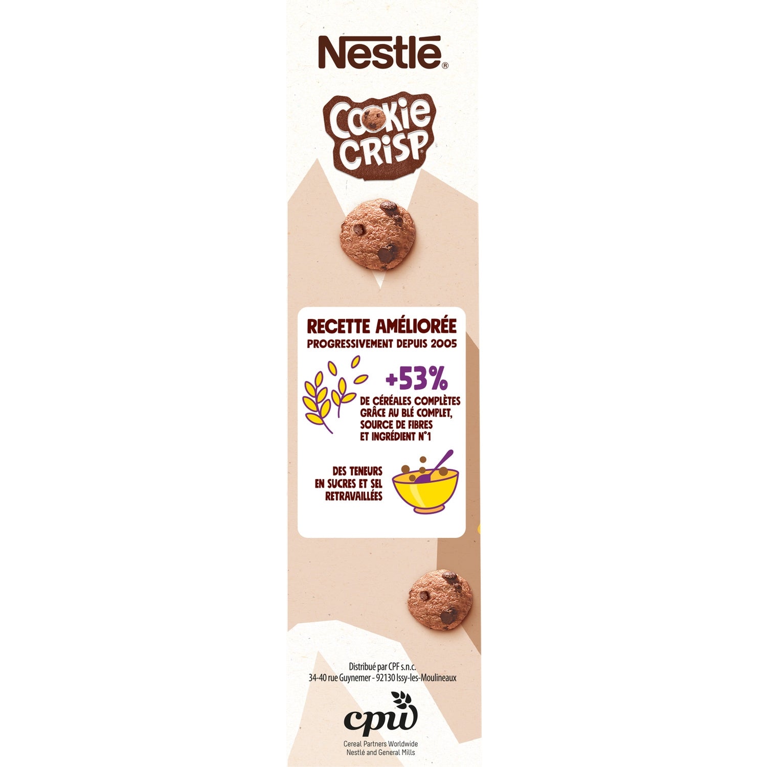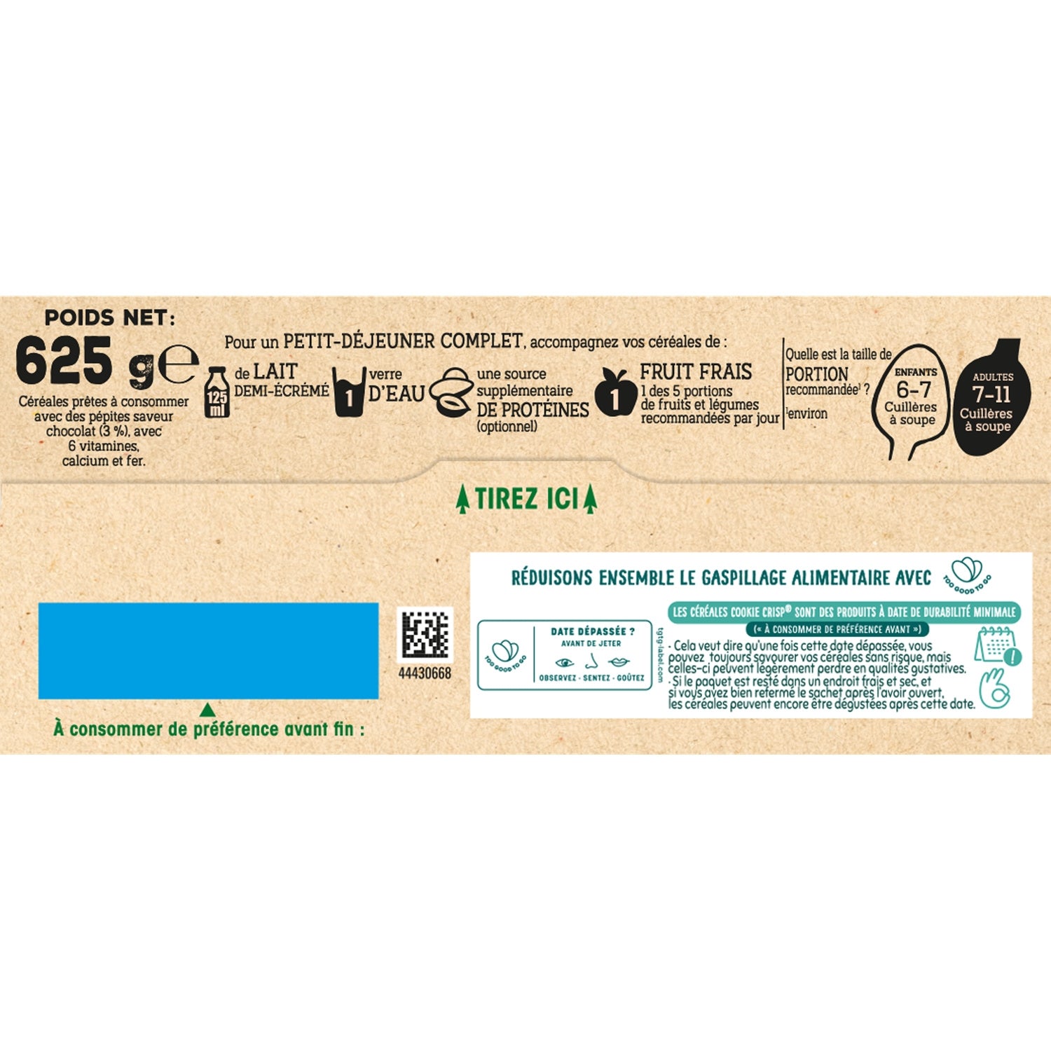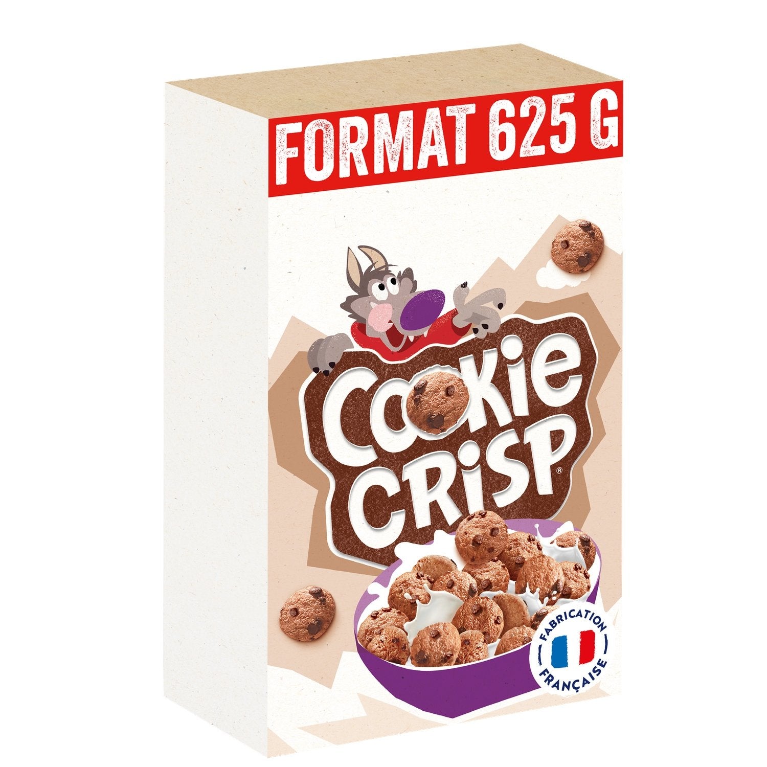 Découvrez les céréales COOKIE CRISP® dans un paquet de 625g : des céréales en forme de mini cookies avec des pépites de chocolat croquantes pour le petit-déjeuner ! Les céréales COOKIE CRISP® NESTLÉ contiennent du blé complet français et sont fabriquées en France. Elles sont garanties sans colorant ni arôme artificiel !