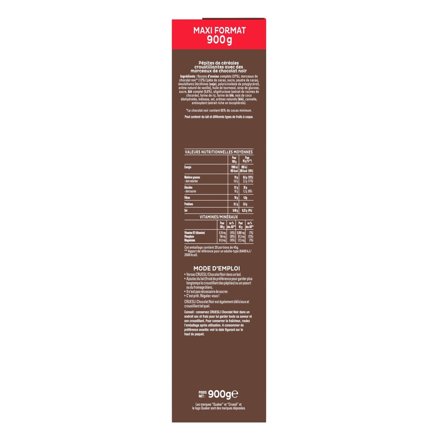 QUAKER CRUESLI, DES PÉPITES CROQUANTES, GOURMANDES, ET DÉLICIEUSES : Quaker Cruesli Chocolat Noir, ce sont des pépites croquantes d'avoine et blé complets délicatement dorées au four, associés à de délicieux ingrédients de qualité (chocolat noir belge, noisette, …). DES CÉRÉALES COMPLÈTES POUR UN PETIT-DÉJEUNER COMPLET ET SAIN : Les céréales Quaker sont naturellement source de fibres, vitamines B1, magnésium, et phosphore pour bien démarrer la journée. Quaker est la marque incontournable pour un petit-déjeuner savoureux pour toute la famille ! Quaker propose exclusivement des céréales sans conservateurs et sans huile de palme. QUAKER, L'EXPERT DE L'AVOINE DEPUIS PLUS DE 140 ANS : C'est en 1877 que deux fermiers d'origine américaine s'associent pour produire de l'avoine complète de qualité supérieure, depuis un petit moulin situé dans l'Ohio. Quaker devient alors la première marque de céréales au monde
