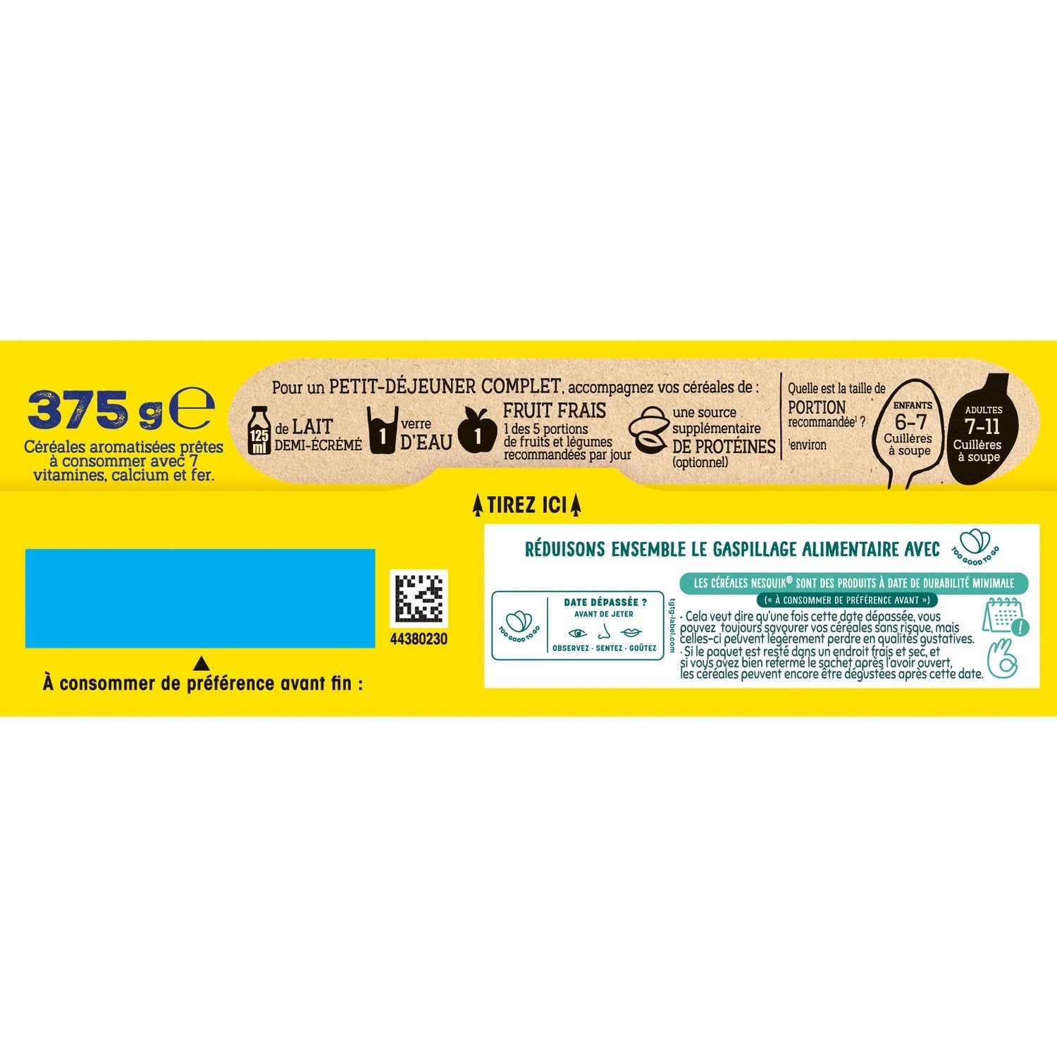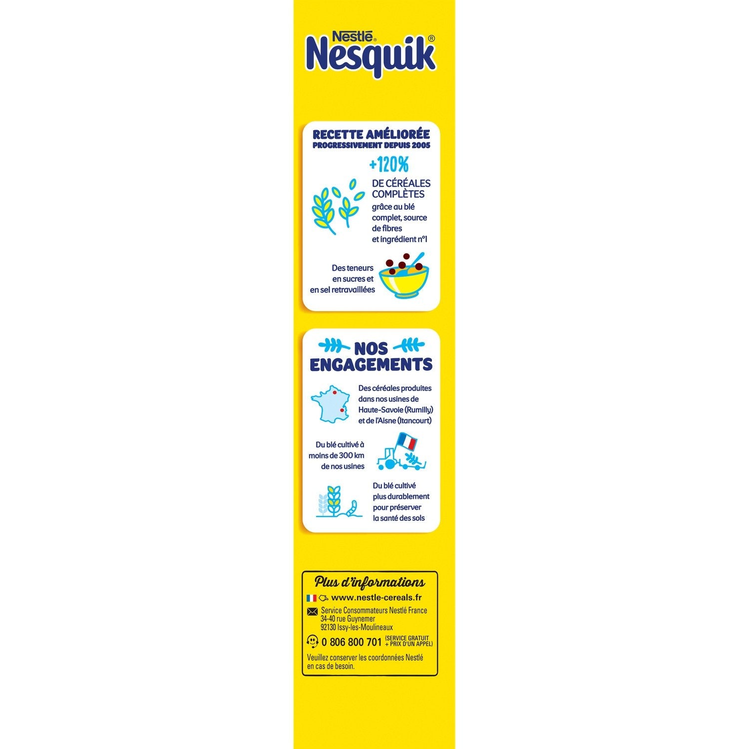 Découvrez les céréales NESQUIK® dans un paquet de 375g : de délicieuses billes de céréales au chocolat pour le petit-déjeuner au blé complet 100% français. Fabriquées en France, les céréales NESQUIK® sont garanties sans colorant ni arôme artificiel ! Et pour varier les plaisirs, NESQUIK® existe aussi en version BIO et en barres de céréales !