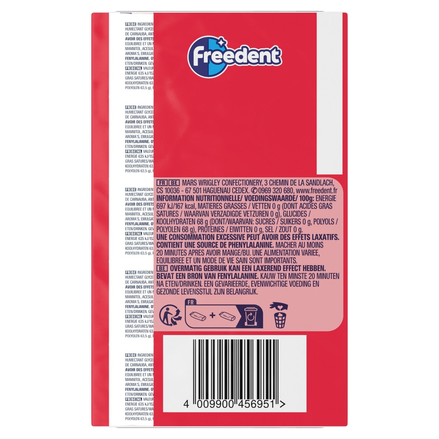 • Sans sucres, les chewing-gum Freedent® vous donnent la confiance de sourire au quotidien. • Freedent®, le premier chewing-gum recommandé par l'Union Française pour la Santé Bucco-Dentaire car il aide à neutraliser les acides de la plaque dentaire. • Conditionnement: 5 étuis de 10 dragées. • Pratique à emporter pour une consommation journalière au travail, à l'école, en voiture, vous offrant un moment de gourmandise.