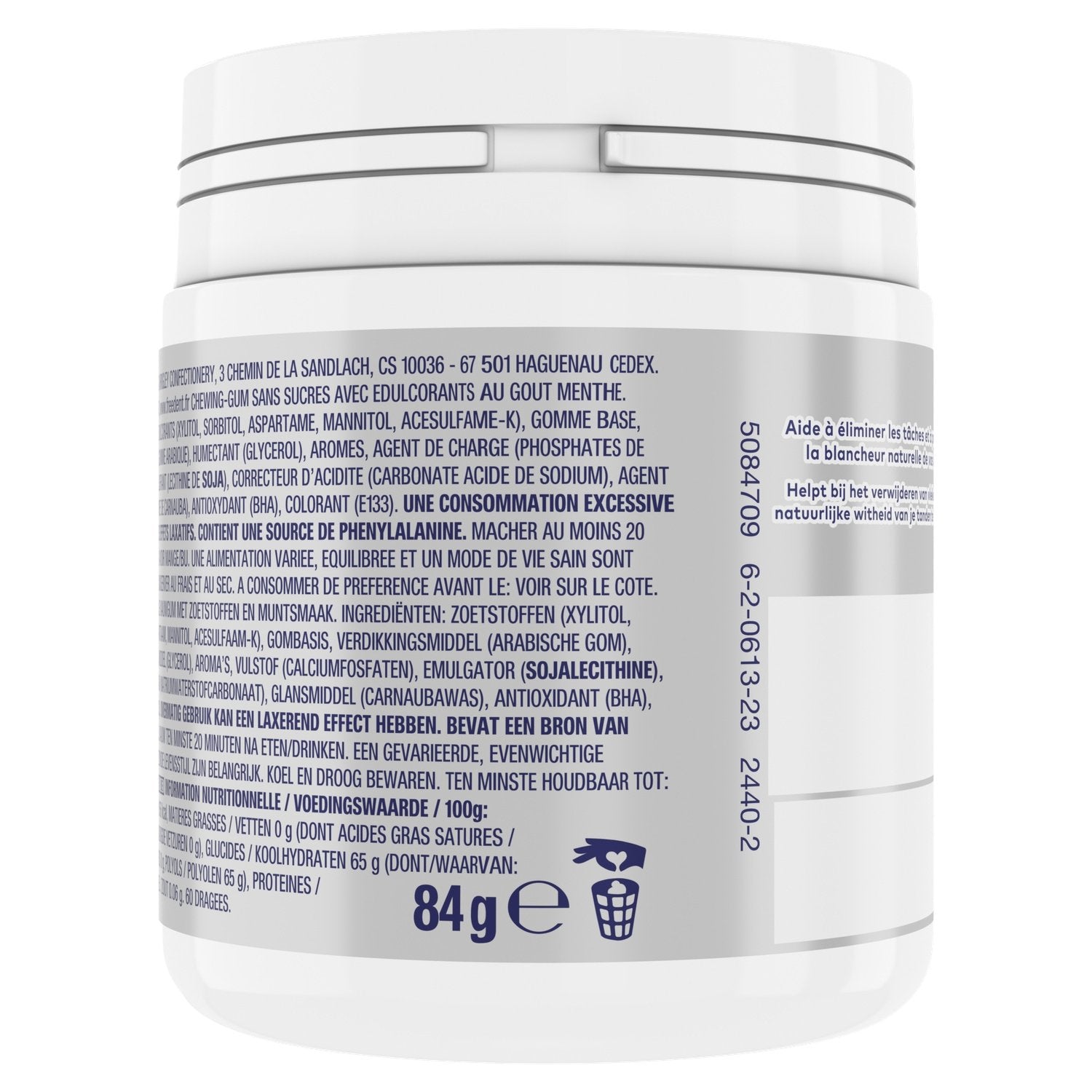 Ingredients: Edulcorants Xylitol, Sorbitol, Aspartame, Mannitol, Acesulfame-k; Gomme Base, Epaississant Gomme Arabique, Humectant Glycerol, Aromes, Agent De Charge Phosphates De Calcium, Emulsifiant Lecithine De SOJA, Correcteur D'acidite Carbonate Acide De Sodium, Agent D'enrobage Cire De Carnauba, Antioxydant Bha, Colorant E133.