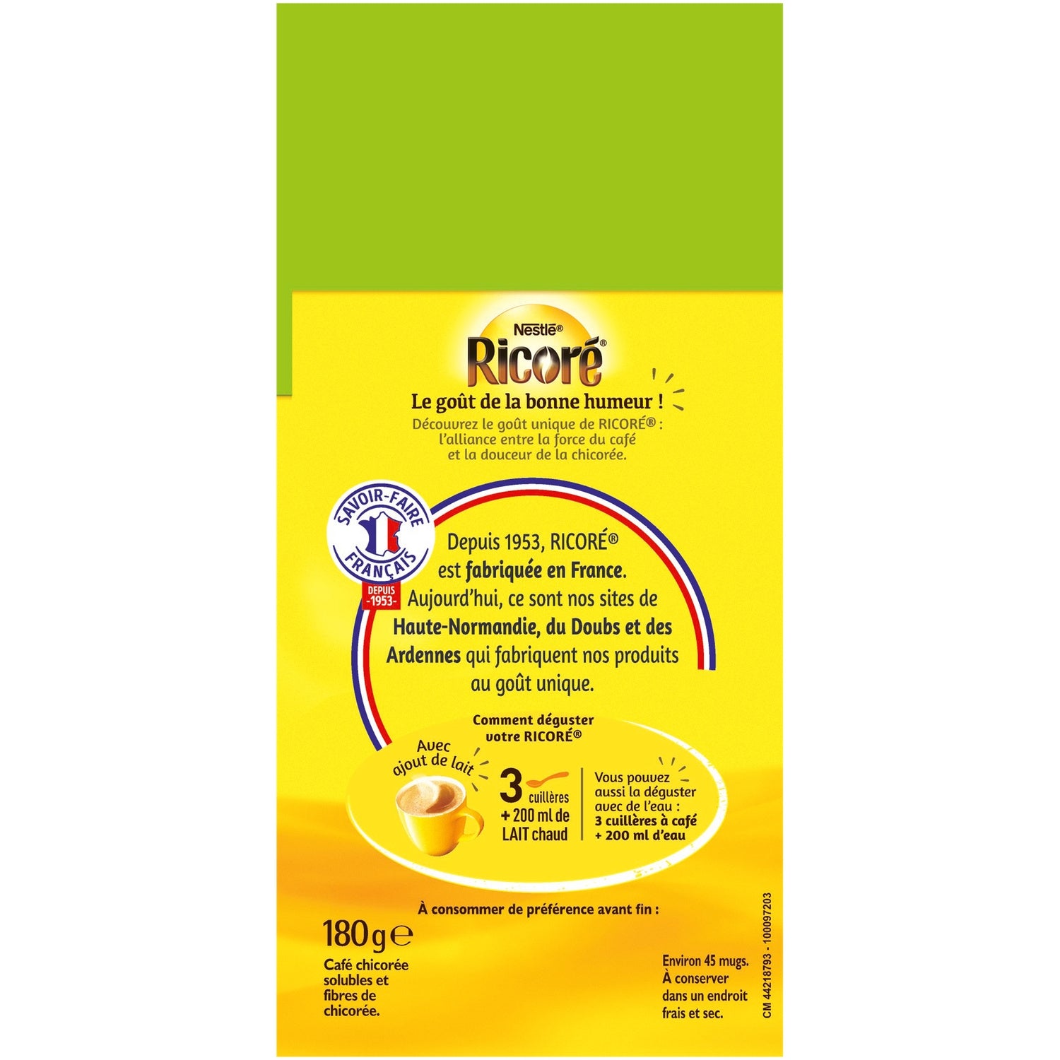 RICORE, le goût de la bonne humeur ! Découvrez le goût unique de la boisson chaude RICORE Original Café & Chicorée : l'alliance entre la force du café et la douceur de la chicorée. À la maison de bon matin, ou l'après-midi entre amis, il y a plein d'occasions pour savourer la boisson RICORE Original Café & Chicorée. Avec RICORE Original, profitez d'un moment de douceur et d'un véritable allié bien-être*. La boisson RICORE Original permet de participer aux apports recommandés en magnésium, contribuant au bon fonctionnement du corps*. RICORE Original vous aidera à démarrer la journée du bon pied avec une boisson délicieuse dont le goût unique fait de nombreux adeptes. Et avec toutes les recettes (RICORE au Lait, RICORE Lait d'Amande, RICORE Noir Intense ou RICORE Cappuccino), variez les plaisirs ! *Préparée selon la préconisation de reconstitution : 4g de RICORE Original + 200 ml de lait chaud. Hors format sticks, apports de référence pour un adulte-type (8400kj / 2000 kcal).