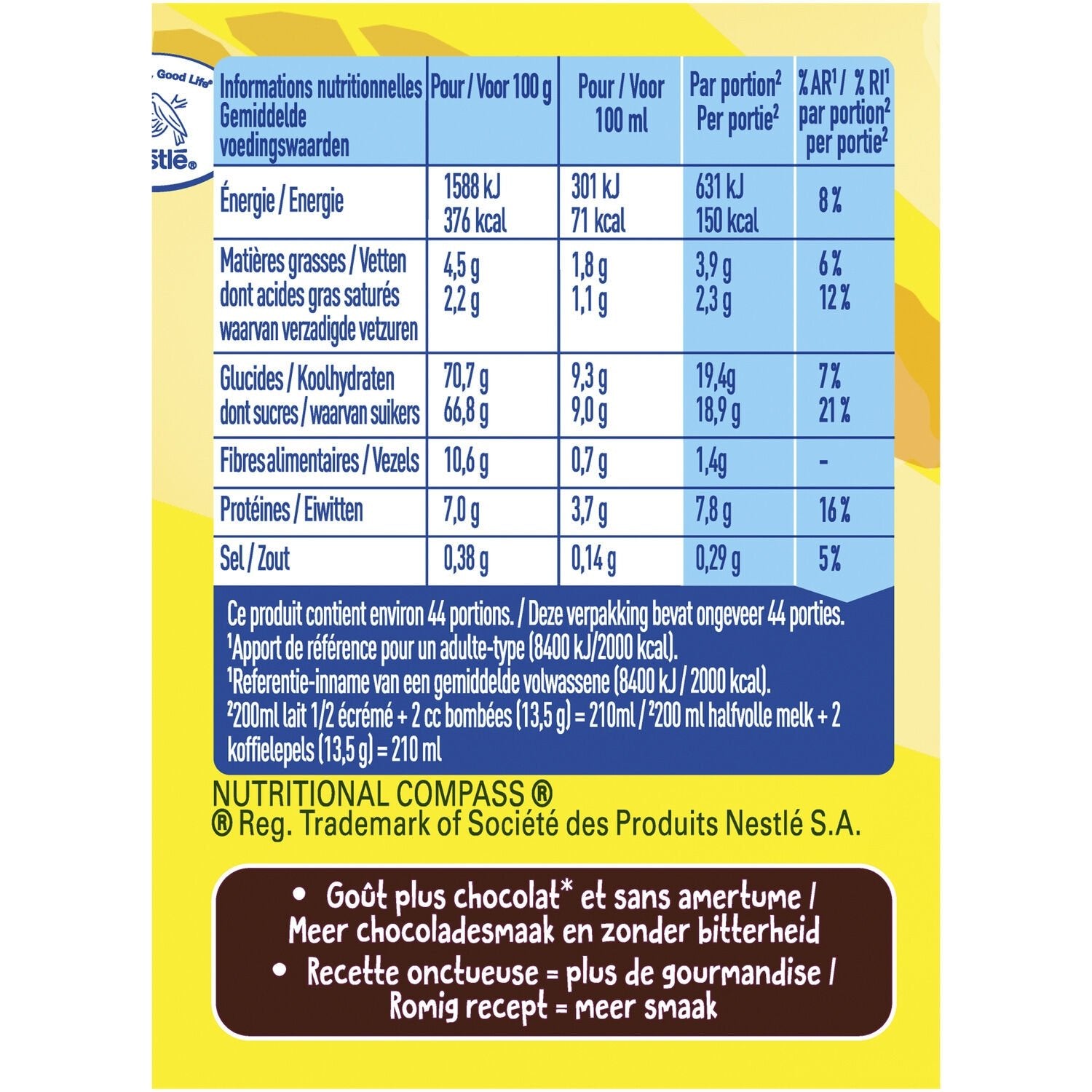 La recette contient 32% de cacao.,Plus fort en cacao par rapport à la recette standard pour répondre aux envies les Plus gourmandes.,Source en vitamines et Minéraux.,Aussi Bon chaud que froid.,Pour toute la famille.