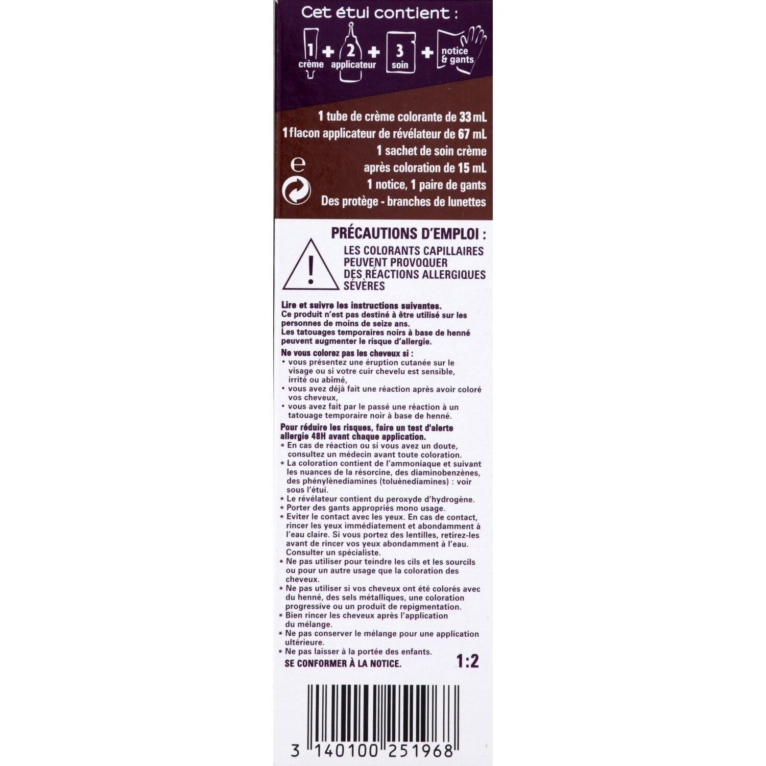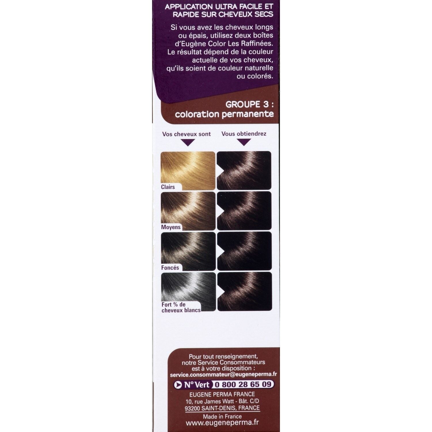 Application ultra facile et rapide sur cheveux secs. Cet étui contient : 1 tube crème colorante de 33 ml + 1 flacon applicateur de révélateur de 67 ml + 1 sachet de soin crème après coloration de 15 ml + 1 notice + 1 paire de gants + des protège-branches de lunettes. Si vous avez les cheveux longs ou épais, utilisez deux boîtes d'Eugène Color Les Raffinées. Le résultat dépend de la couleur actuelle de vos cheveux, qu'ils soient de couleur naturelle ou colorés.